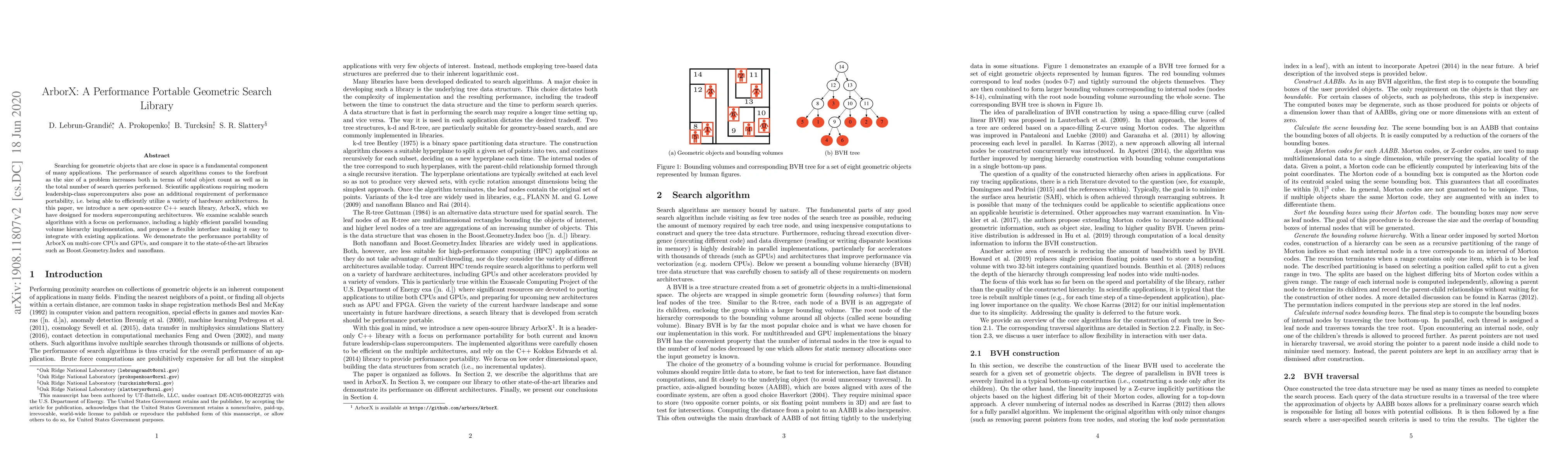 ArborX is an open-source C++ library designed for efficient geometric search algorithms, focusing on performance scalability and portability across various hardware architectures. It features a parallel bounding volume hierarchy and demonstrates competitive performance on multi-core CPUs and GPUs compared to other state-of-the-art libraries.