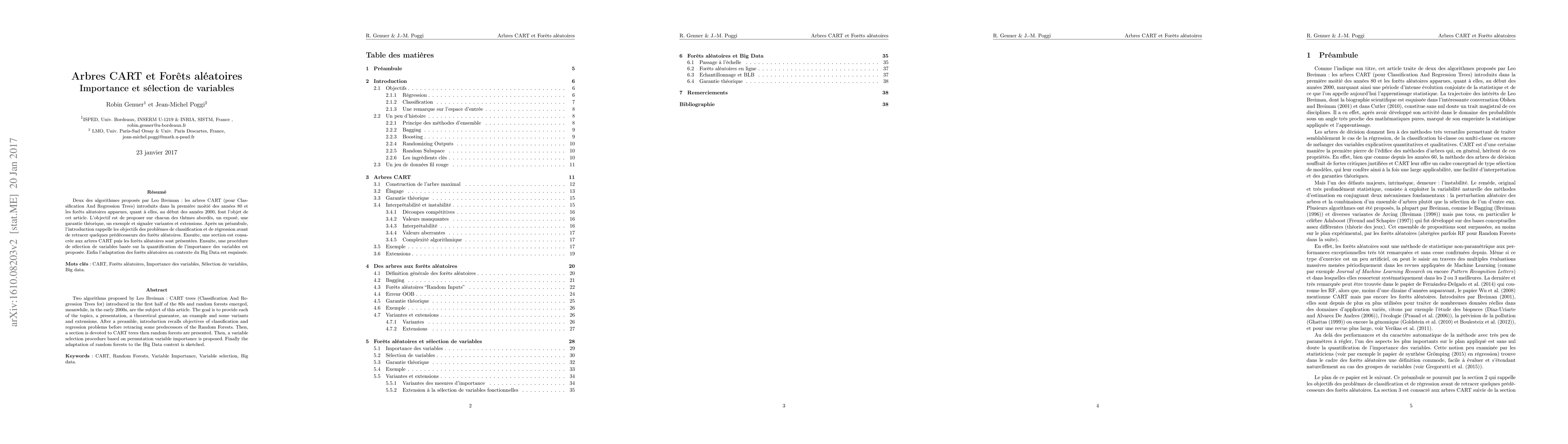 Two algorithms proposed by Leo Breiman : CART trees (Classification And Regression Trees for) introduced in the first half of the 80s and random forests emerged, meanwhile, in the early 2000s, are the subject of this article. The goal is to provide each of the topics, a presentation, a theoretical guarantee, an example and some variants and extensions. After a preamble, introduction recalls objectives of classification and regression problems before retracing some predecessors of the Random Forests. Then, a section is devoted to CART trees then random forests are presented. Then, a variable selection procedure based on permutation variable importance is proposed. Finally the adaptation of random forests to the Big Data context is sketched.