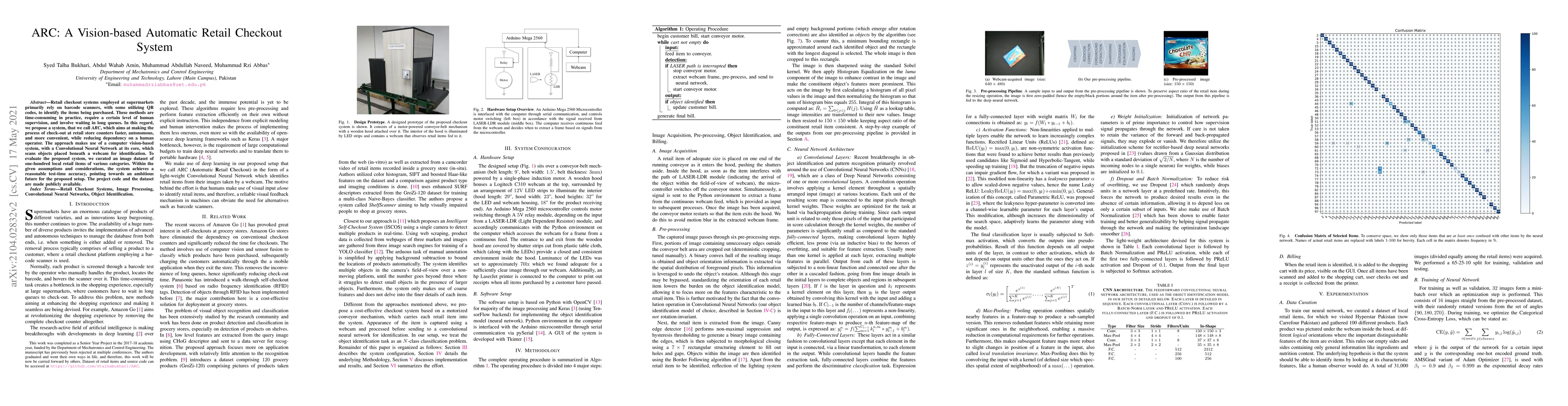 The ARC system proposes a vision-based automatic retail checkout using a Convolutional Neural Network to identify items via a webcam, aiming to speed up checkout and reduce human dependency. Initial results show promising accuracy with a curated dataset of local retail items.