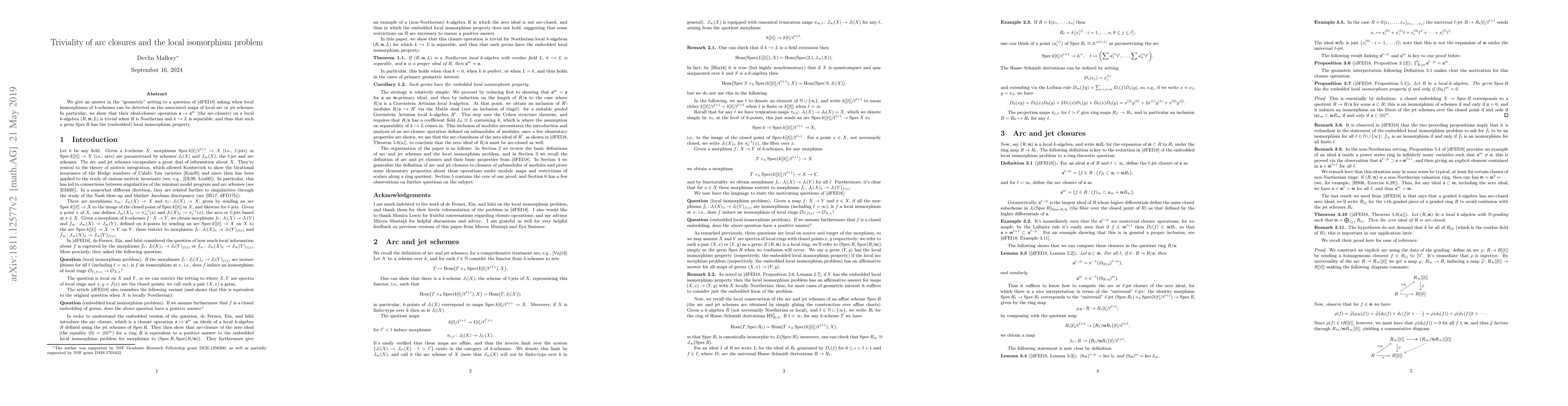 We give an answer in the "geometric" setting to a question of de Fernex, Ein, and Ishii, asking when local isomorphisms of $k$-schemes can be detected on the associated maps of local arc or jet schemes. In particular, we show that their ideal-closure operation $\mathfrak a\mapsto \mathfrak a^{\mathrm{ac}}$ (the arc-closure) on a local $k$-algebra $(R,\mathfrak m,L)$ is trivial when $R$ is Noetherian and $k\hookrightarrow L$ is separable, and thus that such a germ $\mathrm{Spec}\ R$ has the (embedded) local isomorphism property.