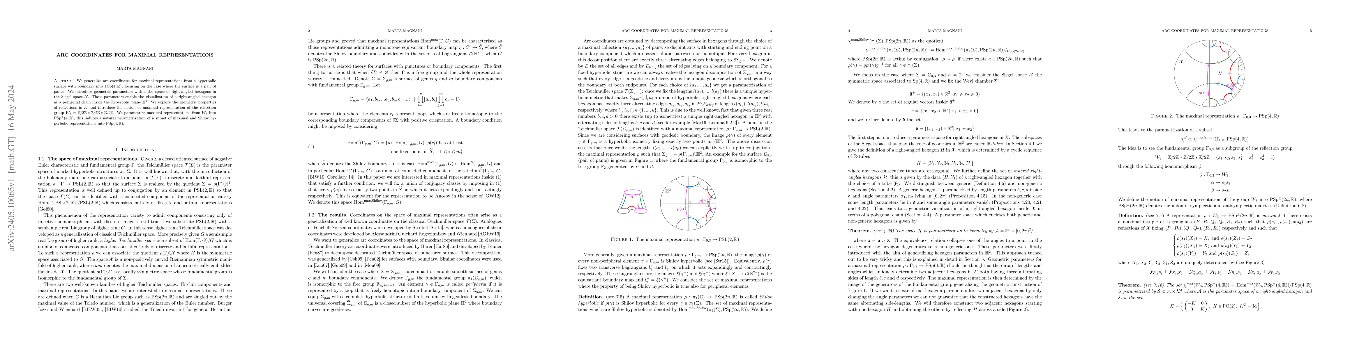 This paper generalizes arc coordinates for maximal representations from a hyperbolic surface with boundary into $\text{PSp}(4,\mathbb{R})$, specifically for a pair of pants. It introduces geometric parameters for visualizing right-angled hexagons and explores the maximal representations of the reflection group $W_{3}$ within $\text{PSp}^{\pm}(4,\mathbb{R})$.