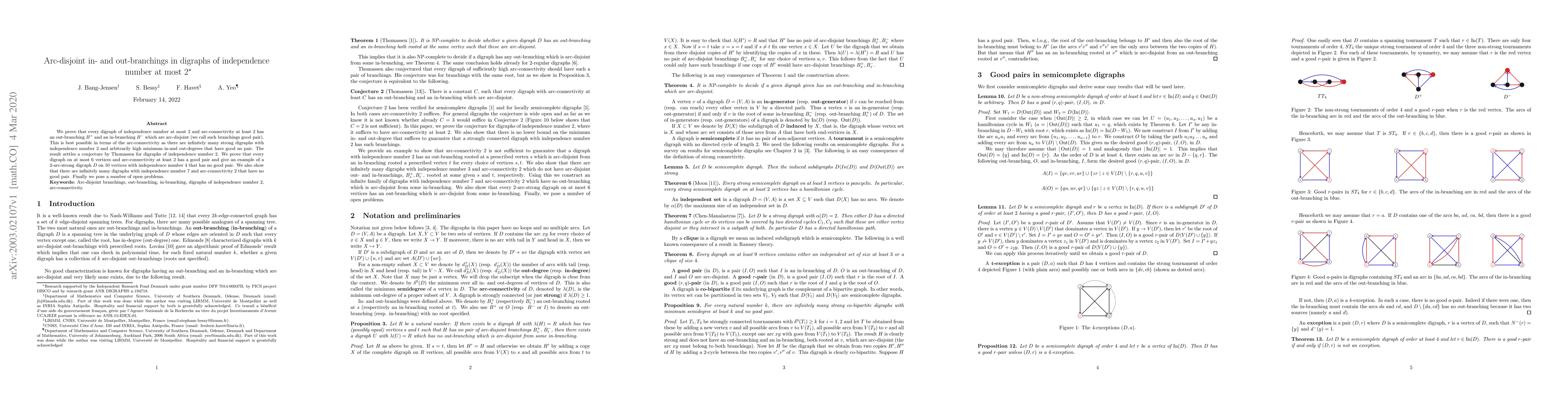 This paper proves that digraphs with an independence number of at most 2 and arc-connectivity at least 2 possess arc-disjoint in- and out-branchings, termed a good pair. It disproves the existence of such pairs in certain digraphs with higher independence numbers and provides open problems for future research.