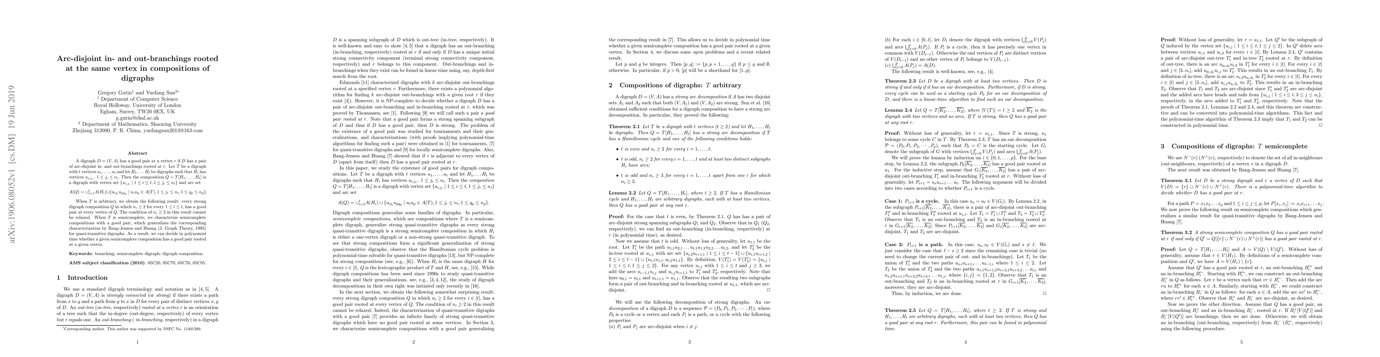 A digraph $D=(V, A)$ has a good pair at a vertex $r$ if $D$ has a pair of arc-disjoint in- and out-branchings rooted at $r$. Let $T$ be a digraph with $t$ vertices $u_1,\dots , u_t$ and let $H_1,\dots H_t$ be digraphs such that $H_i$ has vertices $u_{i,j_i},\ 1\le j_i\le n_i.$ Then the composition $Q=T[H_1,\dots , H_t]$ is a digraph with vertex set $\{u_{i,j_i}\mid 1\le i\le t, 1\le j_i\le n_i\}$ and arc set $$A(Q)=\cup^t_{i=1}A(H_i)\cup \{u_{ij_i}u_{pq_p}\mid u_iu_p\in A(T), 1\le j_i\le n_i, 1\le q_p\le n_p\}.$$ When $T$ is arbitrary, we obtain the following result: every strong digraph composition $Q$ in which $n_i\ge 2$ for every $1\leq i\leq t$, has a good pair at every vertex of $Q.$ The condition of $n_i\ge 2$ in this result cannot be relaxed. When $T$ is semicomplete, we characterize semicomplete compositions with a good pair, which generalizes the corresponding characterization by Bang-Jensen and Huang (J. Graph Theory, 1995) for quasi-transitive digraphs. As a result, we can decide in polynomial time whether a given semicomplete composition has a good pair rooted at a given vertex.