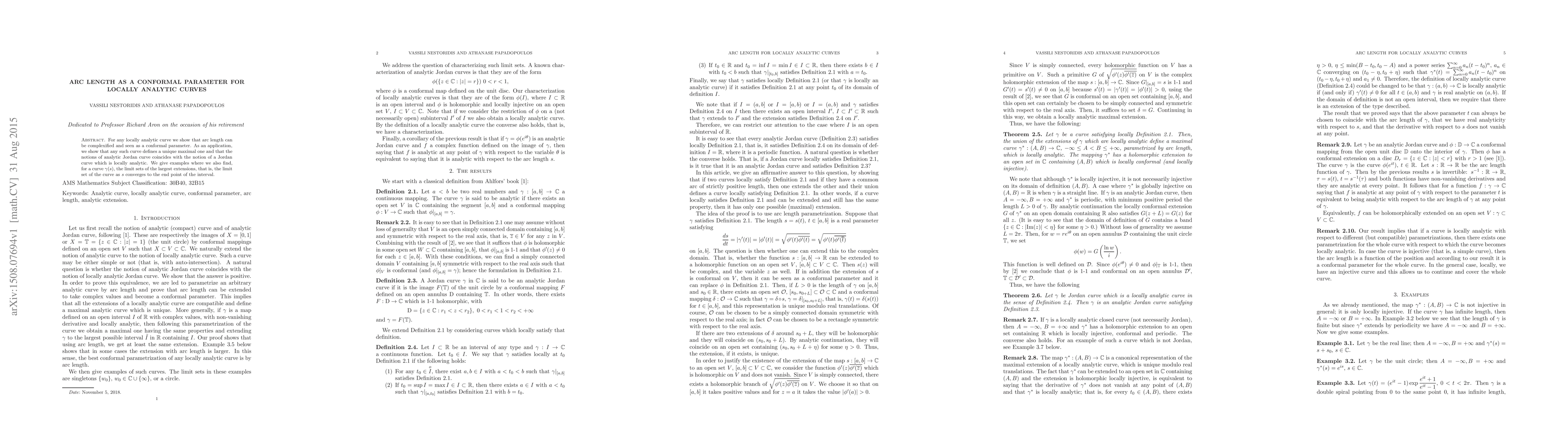 This paper demonstrates that arc length can be utilized as a conformal parameter for locally analytic curves, establishing a unique maximal curve and showing that analytic Jordan curves correspond to locally analytic Jordan curves. Examples are provided to illustrate the limit sets of curve extensions as arc length parameters converge.