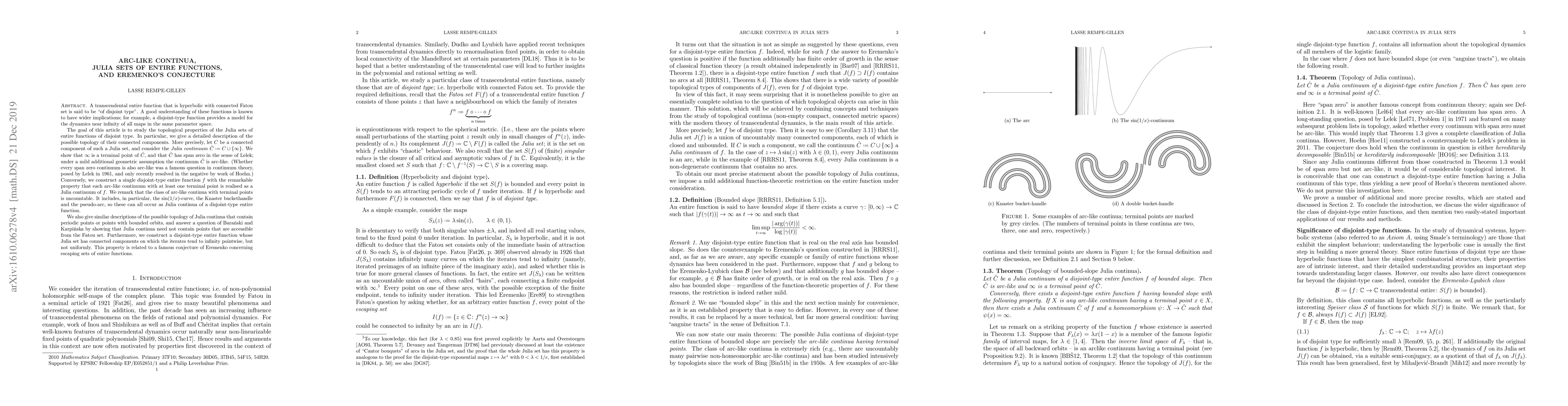 This paper investigates the topological properties of Julia sets for entire functions of disjoint type, showing that their connected components, or Julia continua, often exhibit arc-like characteristics with specific terminal points. It also constructs an entire function where each arc-like continuum with a terminal point can be realized as a Julia continuum, thereby addressing Eremenko's conjecture on escaping sets.