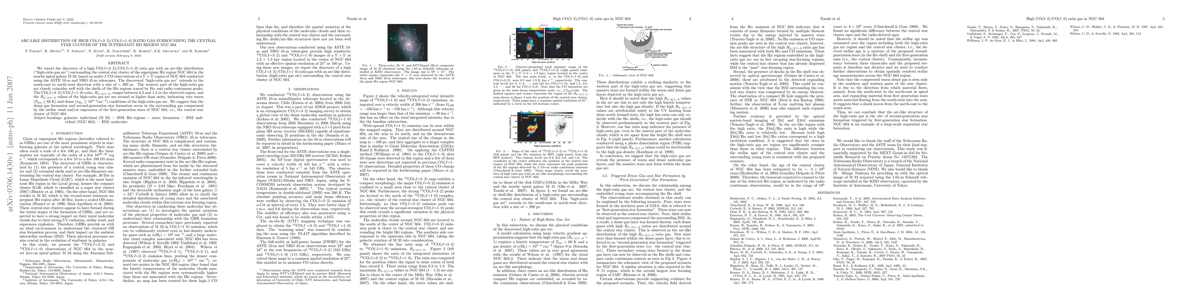 Researchers discovered an arc-like distribution of gas with a high CO(J=3-2)/CO(J=1-0) ratio surrounding the central star cluster of NGC 604 in M 33, indicating warm and dense conditions. This suggests dense gas formation and potential second-generation star formation driven by the first-generation stars' stellar wind and supernovae.