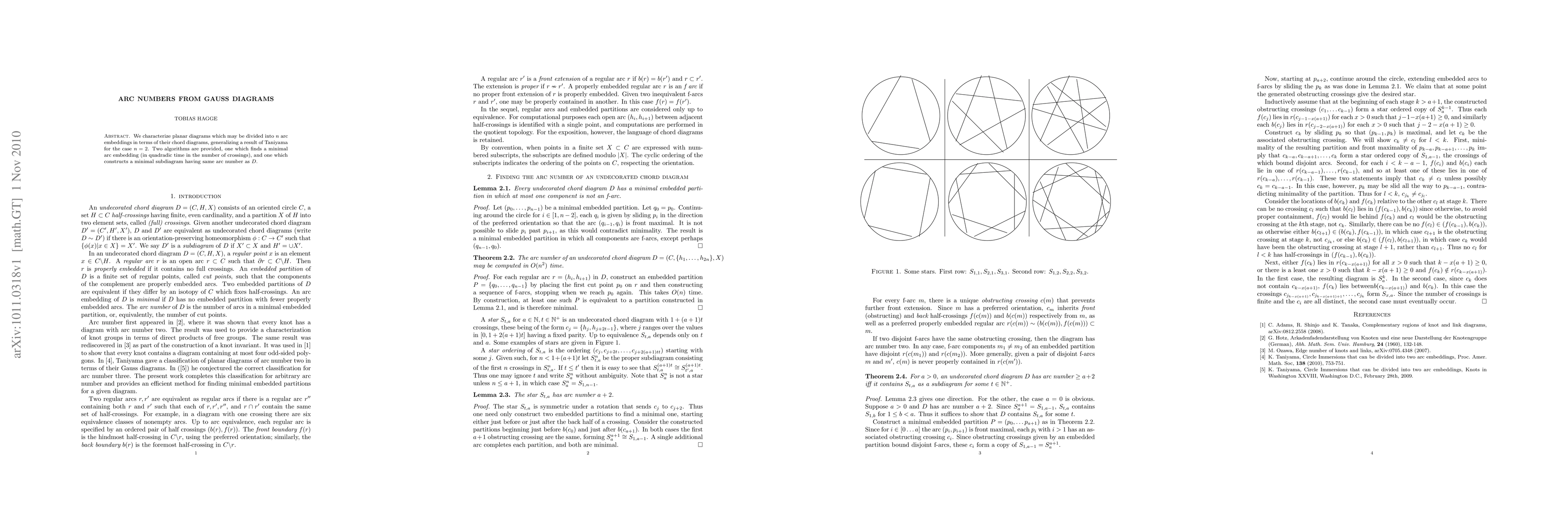 We characterize planar diagrams which may be divided into n arc embeddings in terms of their chord diagrams, generalizing a result of Taniyama for the case n = 2. Two algorithms are provided, one which finds a minimal arc embedding (in quadradic time in the number of crossings), and one which constructs a minimal subdiagram having same arc number as D.