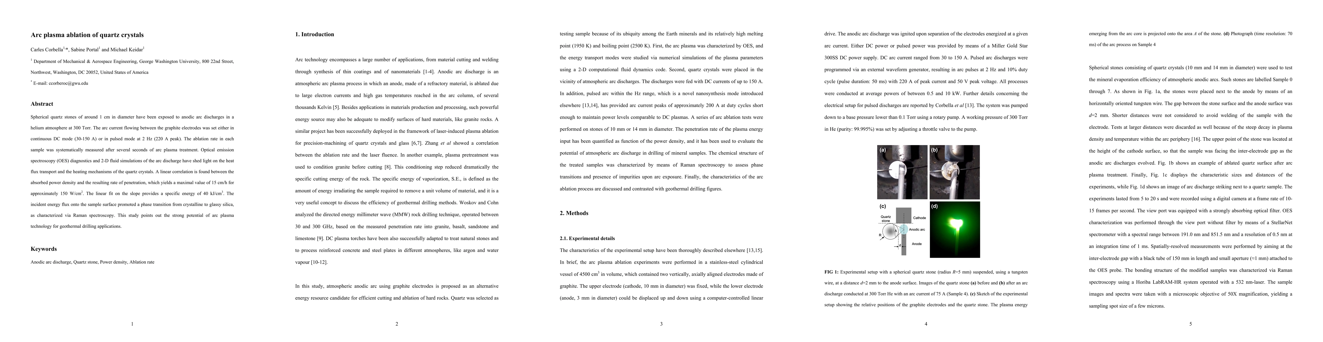 Spherical quartz stones of around 1 cm in diameter have been exposed to anodic arc discharges in a helium atmosphere at 300 Torr. The arc current flowing between the graphite electrodes was set either in continuous DC mode (30-150 A) or in pulsed mode at 2 Hz (220 A peak). The ablation rate in each sample was systematically measured after several seconds of arc plasma treatment. Optical emission spectroscopy (OES) diagnostics and 2-D fluid simulations of the arc discharge have shed light on the heat flux transport and the heating mechanisms of the quartz crystals. A linear correlation is found between the absorbed power density and the resulting rate of penetration, which yields a maximal value of 15 cm/h for approximately 150 W/cm2. The linear fit on the slope provides a specific energy of 40 kJ/cm3. The incident energy flux onto the sample surface promoted a phase transition from crystalline to glassy silica, as characterized via Raman spectroscopy. This study points out the strong potential of arc plasma technology for geothermal drilling applications.