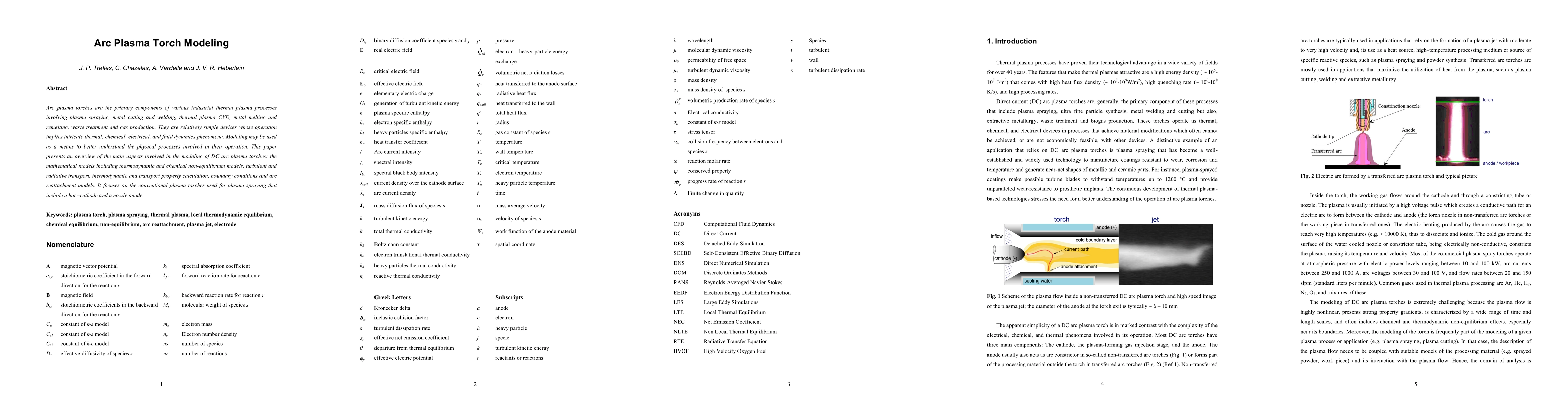 This paper offers an overview of modeling DC arc plasma torches, crucial in industrial processes like spraying, cutting, and welding. It details mathematical models for non-equilibrium thermodynamics, transport, and arc behavior, aiming to enhance understanding of these complex devices.
