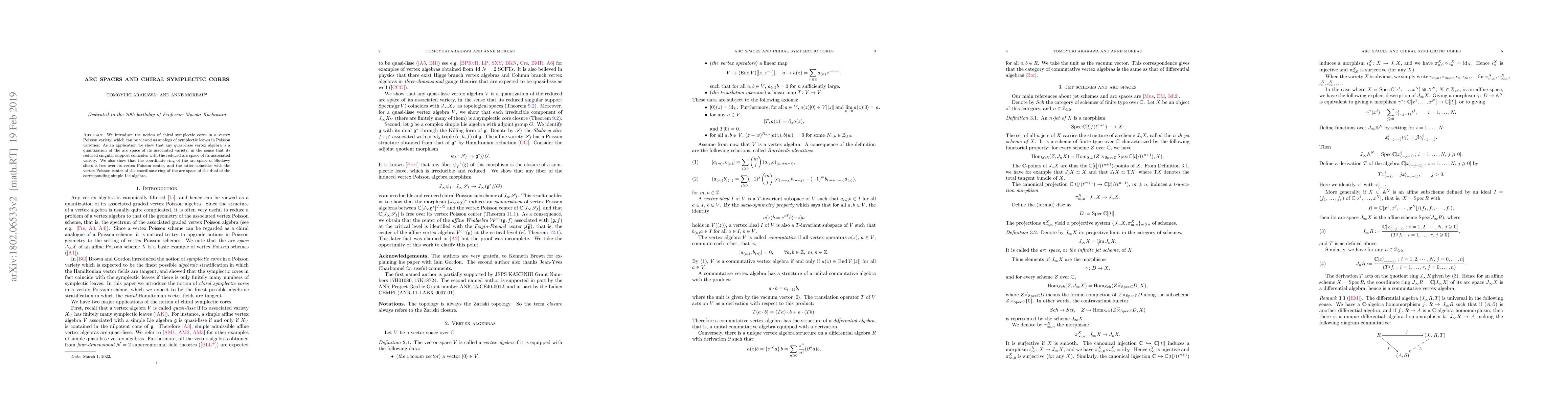 We introduce the notion of chiral symplectic cores in a vertex Poisson variety, which can be viewed as analogs of symplectic leaves in Poisson varieties. As an application we show that any quasi-lisse vertex algebra is a quantization of the arc space of its associated variety, in the sense that its reduced singular support coincides with the reduced arc space of its associated variety. We also show that the coordinate ring of the arc space of Slodowy slices is free over its vertex Poisson center, and the latter coincides with the vertex Poisson center of the coordinate ring of the arc space of the dual of the corresponding simple Lie algebra.
