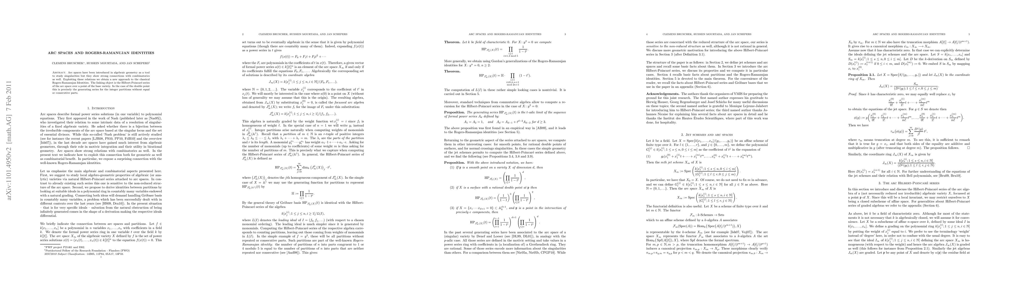 This paper explores the connections between arc spaces in algebraic geometry and combinatorics, using the Hilbert-Poincaré series of arc spaces to provide a new approach to the classical Rogers-Ramanujan Identities, specifically for partitions without equal or consecutive parts.