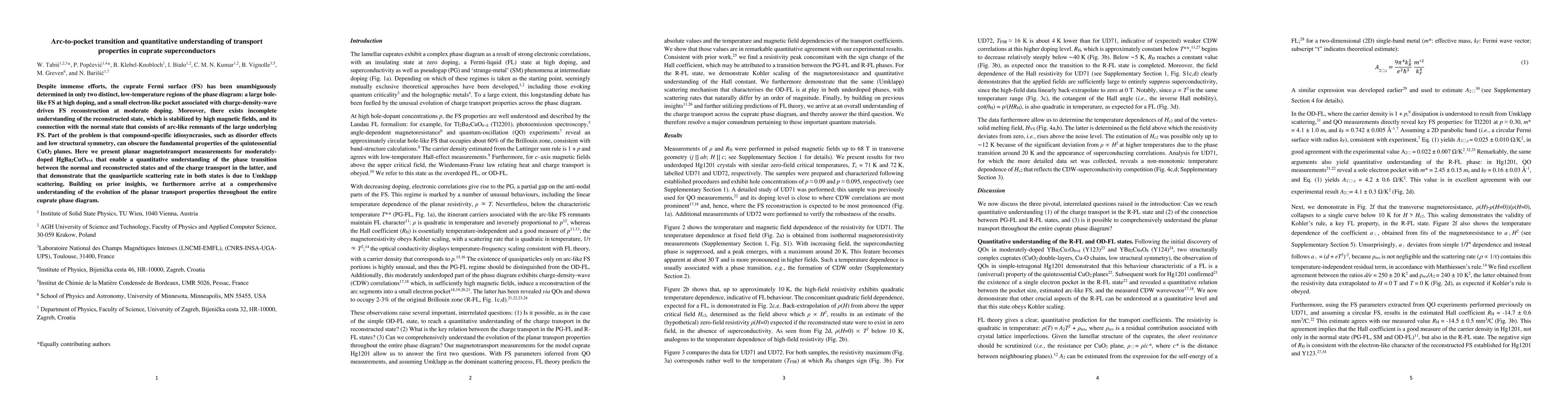 Despite immense efforts, the cuprate Fermi surface (FS) has been unambiguously determined in only two distinct, low-temperature regions of the phase diagram: a large hole-like FS at high doping, and a small electron-like pocket associated with charge-density-wave driven FS reconstruction at moderate doping. Moreover, there exists incomplete understanding of the reconstructed state, which is stabilized by high magnetic fields, and its connection with the normal state that consists of arc-like remnants of the large underlying FS. Part of the problem is that compound-specific idiosyncrasies, such as disorder effects and low structural symmetry, can obscure the fundamental properties of the quintessential CuO$_2$ planes. Here we present planar magnetotransport measurements for moderately-doped HgBa$_2$CuO$_{4+{\delta}}$ that enable a quantitative understanding of the phase transition between the normal and reconstructed states and of the charge transport in the latter, and that demonstrate that the quasiparticle scattering rate in both states is due to Umklapp scattering. Building on prior insights, we furthermore arrive at a comprehensive understanding of the evolution of the planar transport properties throughout the entire cuprate phase diagram.