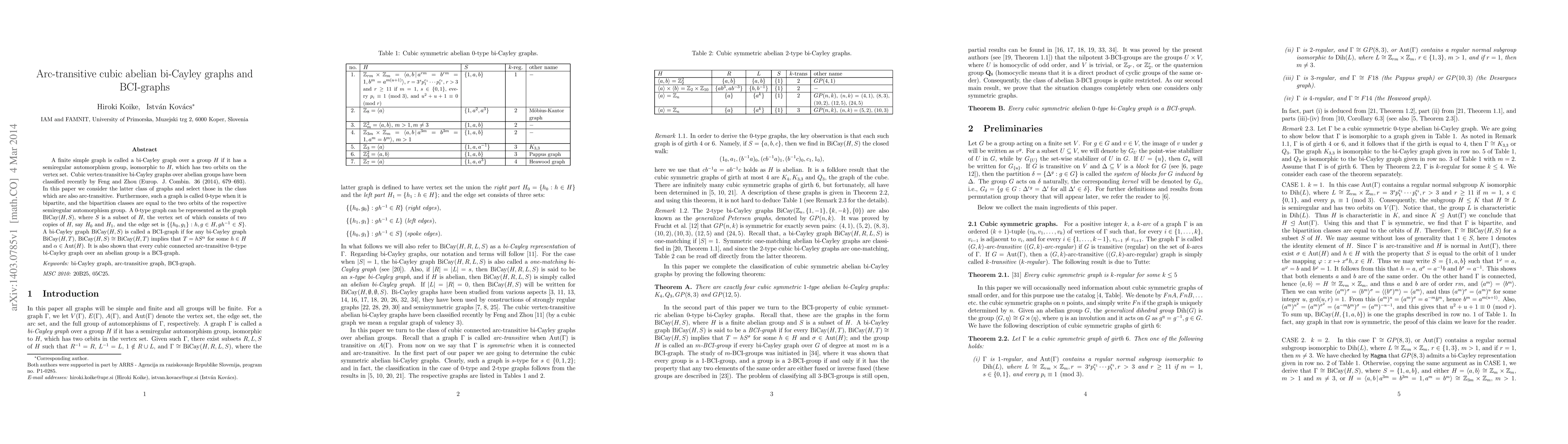 A finite simple graph is called a bi-Cayley graph over a group $H$ if it has a semiregular automorphism group, isomorphic to $H,$ which has two orbits on the vertex set. Cubic vertex-transitive bi-Cayley graphs over abelian groups have been classified recently by Feng and Zhou (Europ. J. Combin. 36 (2014), 679--693). In this paper we consider the latter class of graphs and select those in the class which are also arc-transitive. Furthermore, such a graph is called $0$-type when it is bipartite, and the bipartition classes are equal to the two orbits of the respective semiregular automorphism group. A $0$-type graph can be represented as the graph $\mathrm{BCay}(H,S),$ where $S$ is a subset of $H,$ the vertex set of which consists of two copies of $H,$ say $H_0$ and $H_1,$ and the edge set is $\{\{h_0,g_1\} : h,g \in H, g h^{-1} \in S\}$. A bi-Cayley graph $\mathrm{BCay}(H,S)$ is called a BCI-graph if for any bi-Cayley graph $\mathrm{BCay}(H,T),$ $\mathrm{BCay}(H,S) \cong \mathrm{BCay}(H,T)$ implies that $T = h S^\alpha$ for some $h \in H$ and $\alpha \in \mathrm{Aut}(H)$. It is also shown that every cubic connected arc-transitive $0$-type bi-Cayley graph over an abelian group is a BCI-graph.