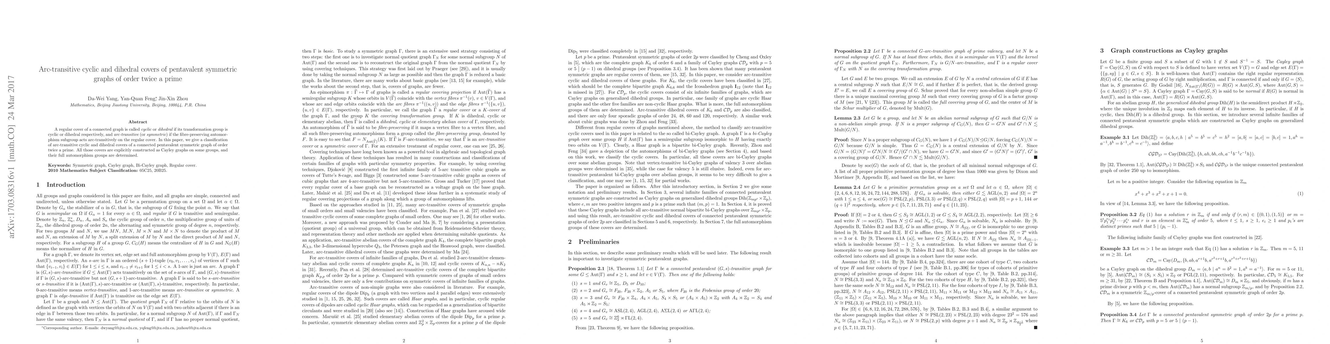 This paper classifies and constructs arc-transitive cyclic and dihedral covers of a pentavalent symmetric graph of order twice a prime, showing each as a Cayley graph on specific groups and determining their full automorphism groups.