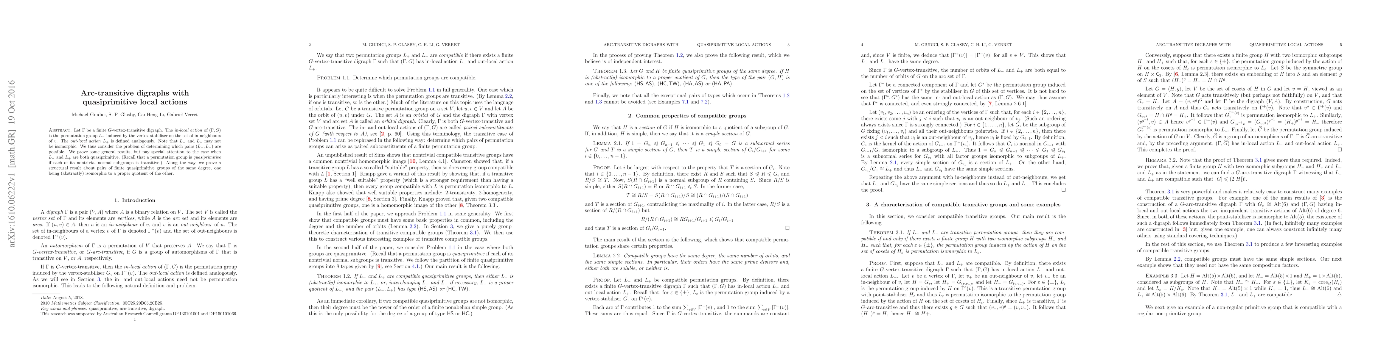 Let $\Gamma$ be a finite $G$-vertex-transitive digraph. The in-local action of $(\Gamma,G)$ is the permutation group $L_-$ induced by the vertex-stabiliser on the set of in-neighbours of $v$. The out-local action $L_+$ is defined analogously. Note that $L_-$ and $L_+$ may not be isomorphic. We thus consider the problem of determining which pairs $(L_-,L_+)$ are possible. We prove some general results, but pay special attention to the case when $L_-$ and $L_+$ are both quasiprimitive. (Recall that a permutation group is quasiprimitive if each of its nontrivial normal subgroups is transitive.) Along the way, we prove a structural result about pairs of finite quasiprimitive groups of the same degree, one being (abstractly) isomorphic to a proper quotient of the other.