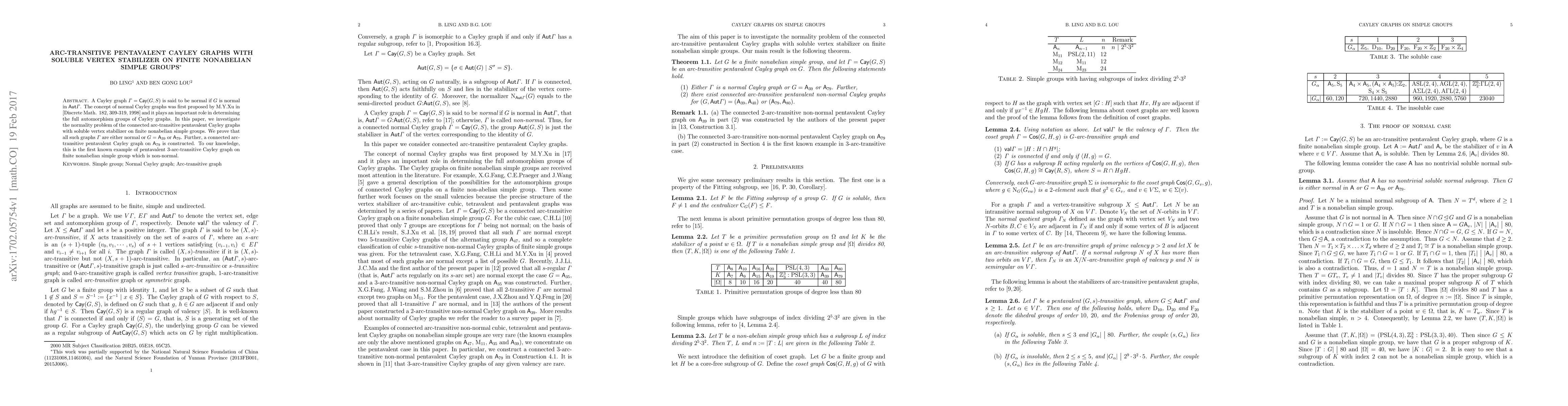 This paper explores the normality of arc-transitive pentavalent Cayley graphs on finite nonabelian simple groups with soluble vertex stabilizers. It demonstrates that such graphs are either normal or associated with specific groups, notably constructing the first known non-normal pentavalent 3-arc-transitive Cayley graph on the simple group $\A_{79}$.