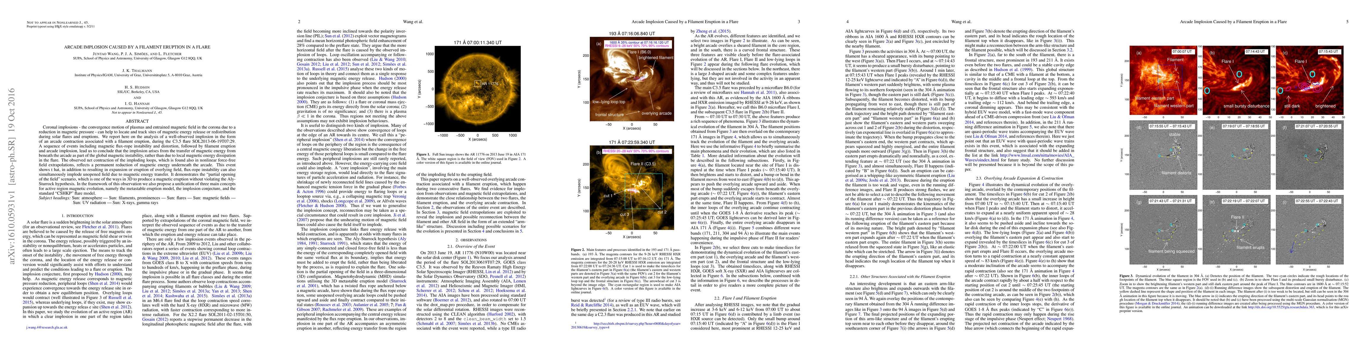 This paper analyzes a coronal implosion during a filament eruption in the C3.5 flare SOL2013-06-19T07:29, revealing that the implosion results from magnetic energy transfer beneath the arcade due to global magnetic instability, rather than local dissipation. The study unifies three models of active region magnetic evolution, demonstrating the "partial opening of the field" mechanism for magnetic eruptions.