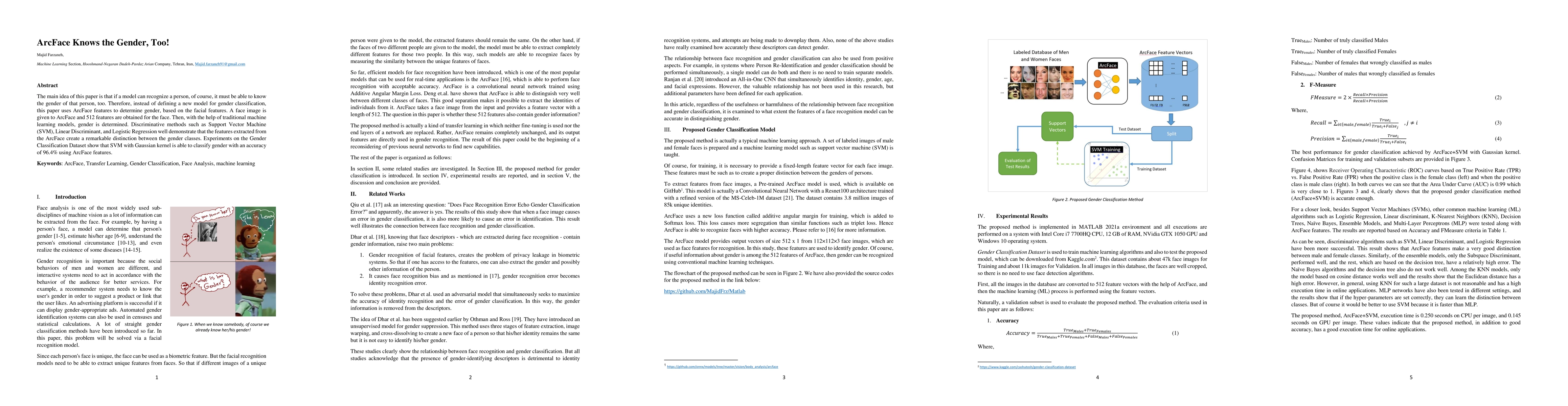 The main idea of this paper is that if a model can recognize a person, of course, it must be able to know the gender of that person, too. Therefore, instead of defining a new model for gender classification, this paper uses ArcFace features to determine gender, based on the facial features. A face image is given to ArcFace and 512 features are obtained for the face. Then, with the help of traditional machine learning models, gender is determined. Discriminative methods such as Support Vector Machine (SVM), Linear Discriminant, and Logistic Regression well demonstrate that the features extracted from the ArcFace create a remarkable distinction between the gender classes. Experiments on the Gender Classification Dataset show that SVM with Gaussian kernel is able to classify gender with an accuracy of 96.4% using ArcFace features.
