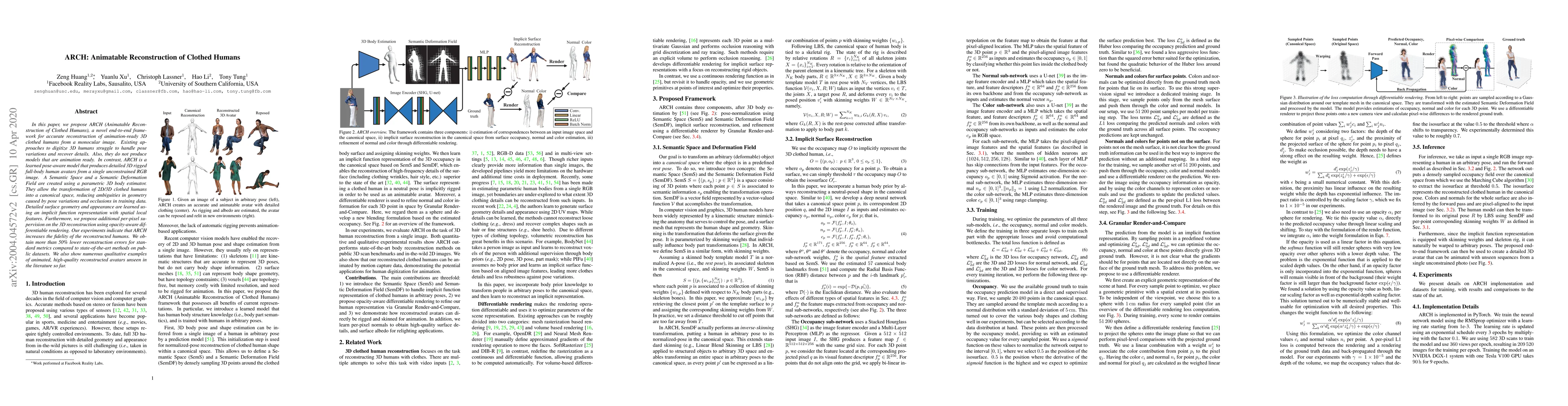 ARCH is a novel framework for reconstructing animation-ready 3D clothed human avatars from a single monocular image. It achieves higher fidelity and lower reconstruction errors compared to existing methods, utilizing a Semantic Space and Semantic Deformation Field for canonical transformation and implicit function representation for detailed geometry.