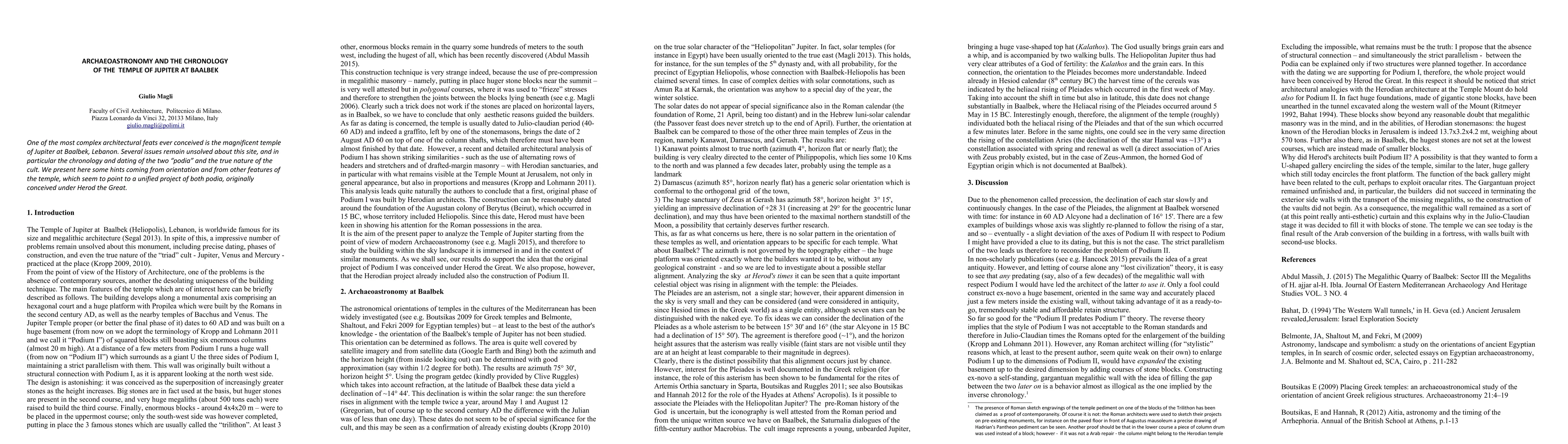 The Temple of Jupiter at Baalbek in Lebanon has long puzzled archaeologists with its chronology and cult nature. New research suggests that the two podia may have been part of a unified project by Herod the Great.