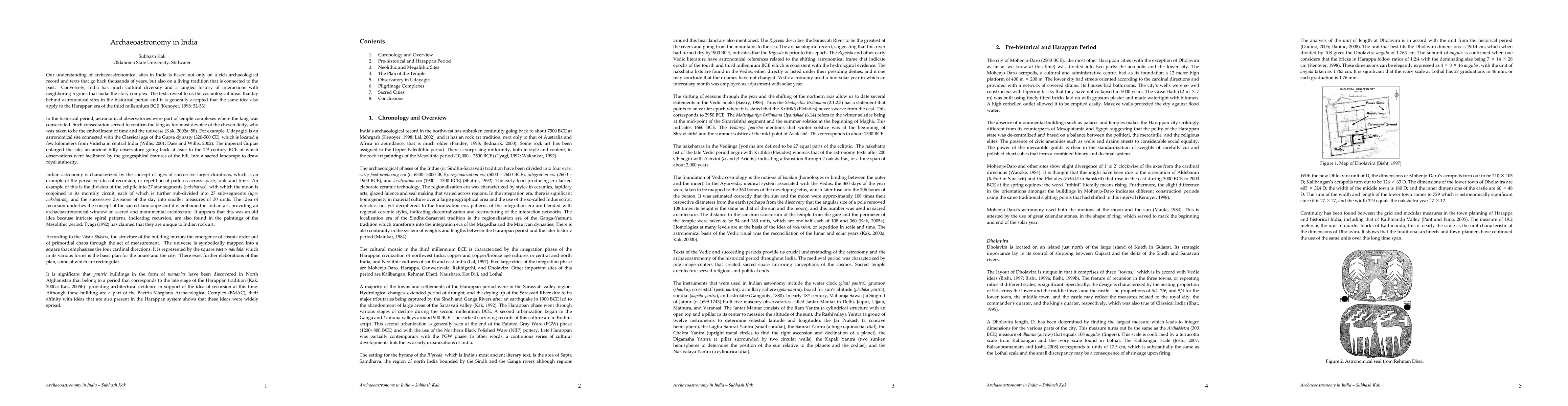 The paper reviews archaeoastronomy in India, highlighting significant discoveries of astronomical alignments in ancient structures. It emphasizes the integration of astronomy in religious practices and architectural planning, providing insights into the sophisticated understanding of celestial phenomena by ancient Indians.