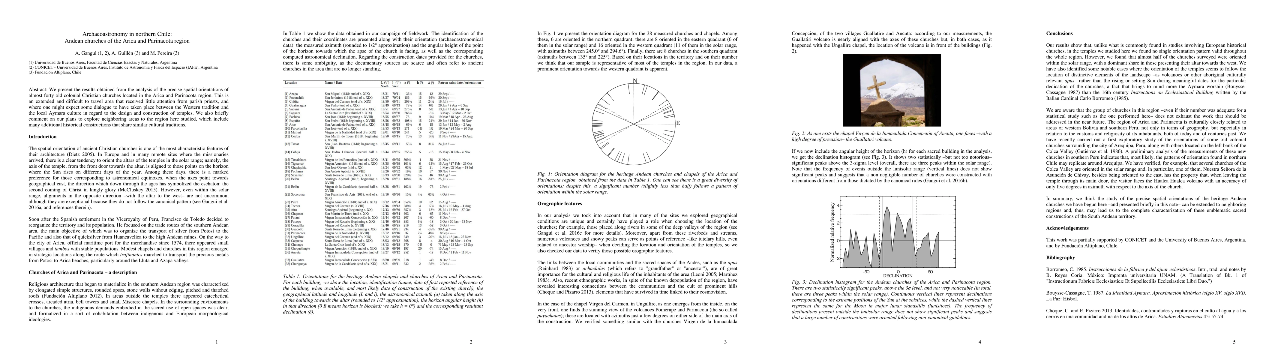We present the results obtained from the analysis of the precise spatial orientations of almost forty old colonial Christian churches located in the Arica and Parinacota region. This is an extended and difficult to travel area that received little attention from parish priests, and where one might expect some dialogue to have taken place between the Western tradition and the local Aymara culture in regard to the design and construction of temples. We also briefly comment on our plans to explore neighboring areas to the region here studied, which include many additional historical constructions that share similar cultural traditions.