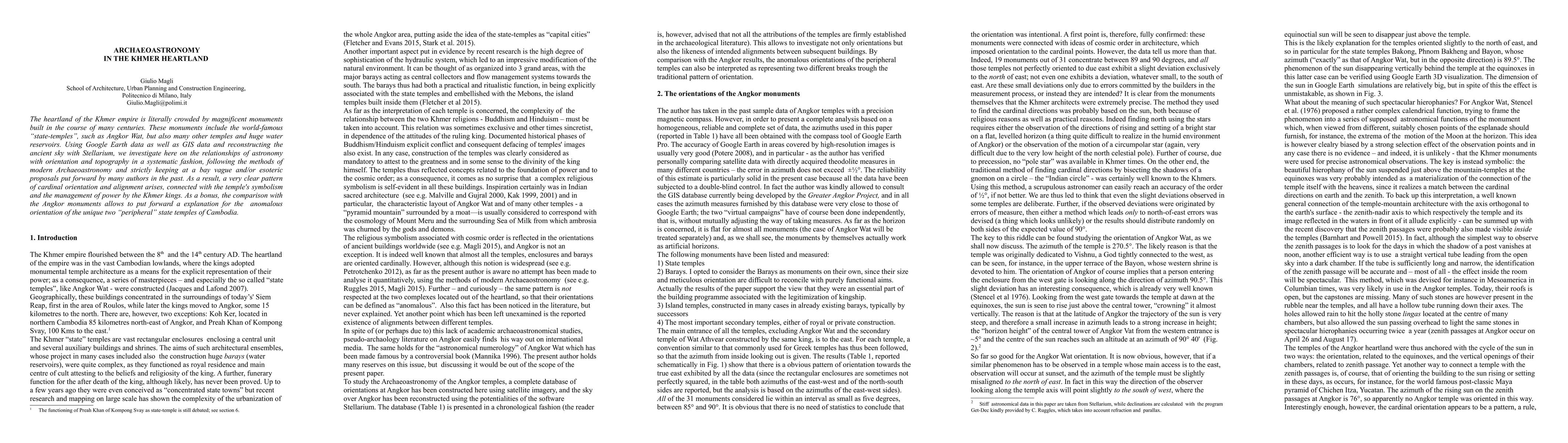 The heartland of the Khmer empire is literally crowded by magnificent monuments built in the course of many centuries. These monuments include the world-famous state-temples, such as Angkor Wat, but also many other temples and huge water reservoirs. Using Google Earth data as well as GIS data and reconstructing the ancient sky with Stellarium, we investigate here on the relationships of astronomy with orientation and topography in a systematic fashion, following the methods of modern Archaeoastronomy and strictly keeping at a bay vague or esoteric proposals put forward by many authors in the past. As a result, a very clear pattern of cardinal orientation and alignment arises, connected with the temple's symbolism and the management of power by the Khmer kings. As a bonus, the comparison with the Angkor monuments allows to put forward a explanation for the anomalous orientation of the unique two peripheral state temples of Cambodia.