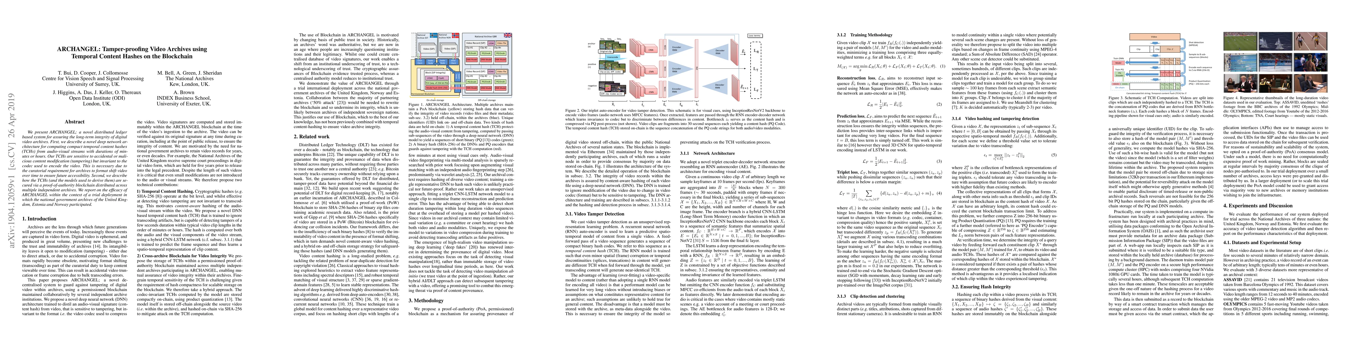 ARCHANGEL is a blockchain-based system that uses temporal content hashes to ensure the long-term integrity of digital video archives. The system employs a deep network architecture to generate tamper-sensitive hashes invariant to video codec changes, and secures these hashes via a distributed blockchain, demonstrated through a trial involving national government archives in the UK, Estonia, and Norway.