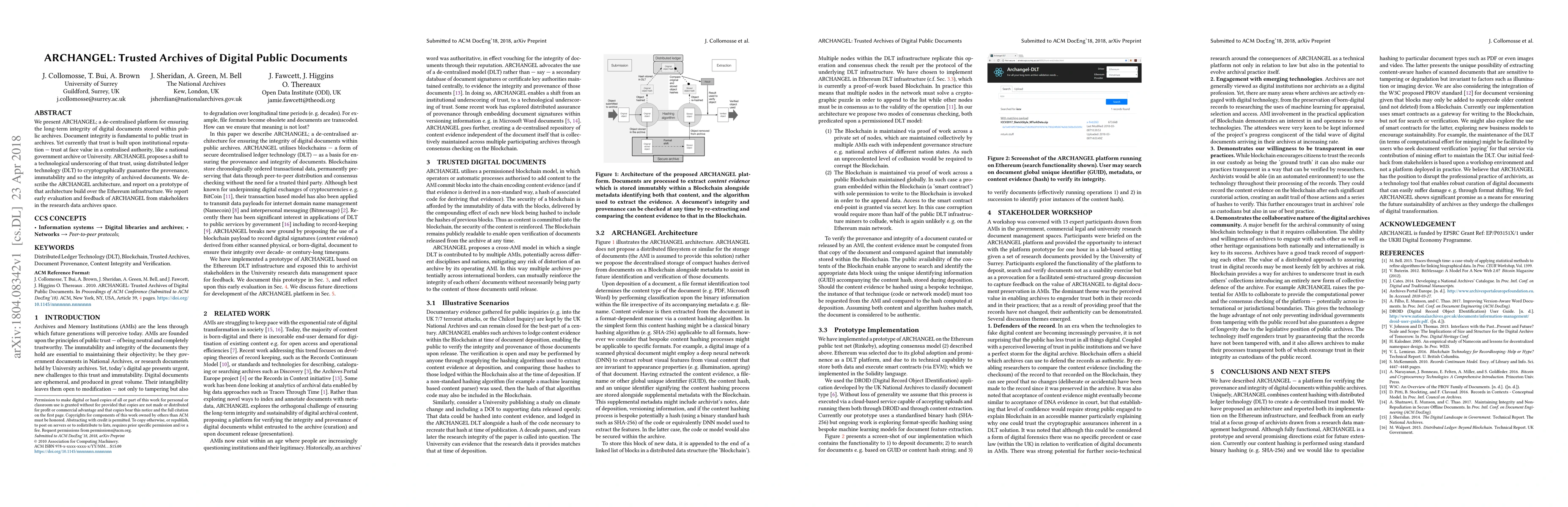 ARCHANGEL is a decentralized platform leveraging distributed ledger technology to ensure the long-term integrity of digital public documents, shifting trust from centralized authorities to cryptographic guarantees. Initial prototype and stakeholder feedback indicate potential for enhancing public trust in digital archives.