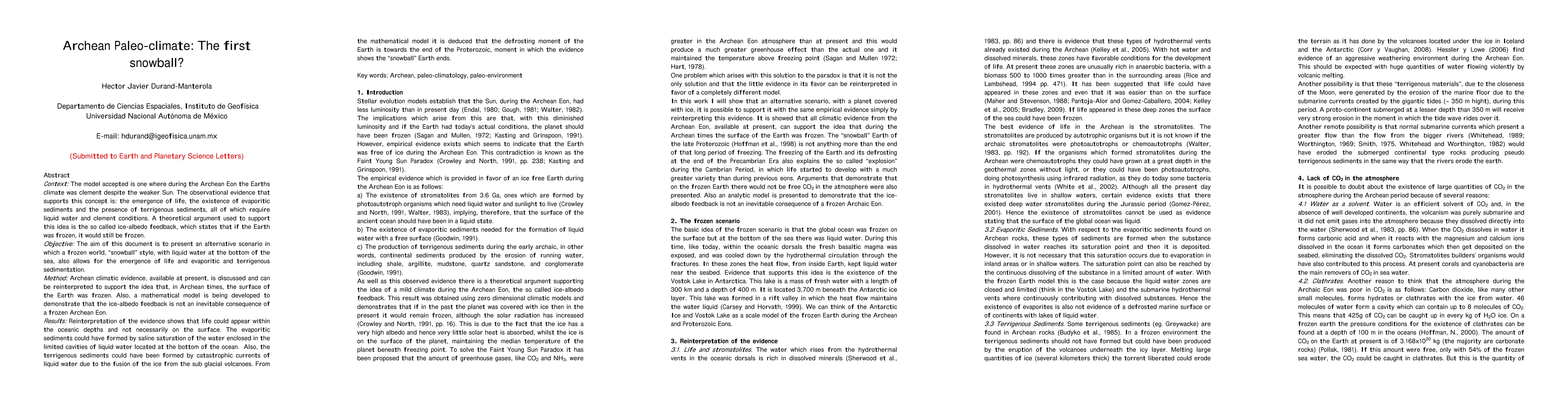 The model accepted is one where during the Archean Eon the Earths climate was clement despite the weaker Sun. The observational evidence that supports this concept is: the emergence of life, the existence of evaporitic sediments and the presence of terrigenous sediments, all of which require liquid water and clement conditions. A theoretical argument used to support this idea is the so called ice-albedo feedback, which states that if the Earth was frozen, it would still be frozen.The aim of this document is to present an alternative scenario in which a frozen world, "snowball" style, with liquid water at the bottom of the sea, also allows for the emergence of life and evaporitic and terrigenous sedimentation. Archean climatic evidence, available at present, is discussed and can be reinterpreted to support the idea that, in Archean times, the surface of the Earth was frozen. Also, a mathematical model is being developed to demonstrate that the ice-albedo feedback is not an inevitable consequence of a frozen Archean Eon. Results: Reinterpretation of the evidence shows that life could appear within the oceanic depths and not necessarily on the surface. The evaporitic sediments could have formed by saline saturation of the water enclosed in the limited cavities of liquid water located at the bottom of the ocean. Also, the terrigenous sediments could have been formed by catastrophic currents of liquid water due to the fusion of the ice from the sub glacial volcanoes. From the mathematical model it is deduced that the defrosting moment of the Earth is towards the end of the Proterozoic, moment in which the evidence shows the "snowball" Earth ends.