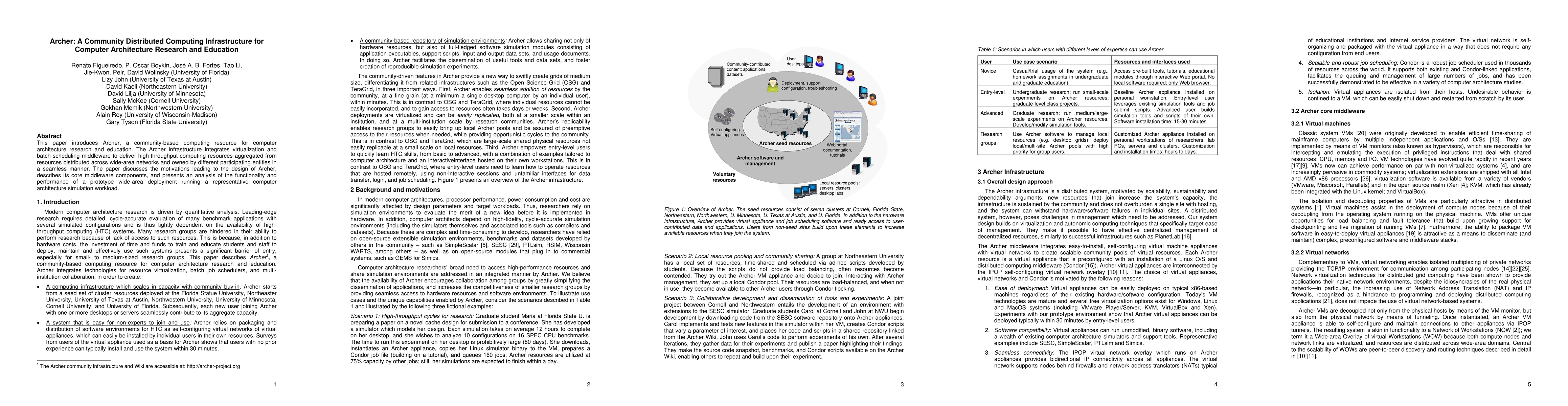 Summary: Archer is a community-based distributed computing infrastructure designed for computer architecture research and education, utilizing virtualization and batch scheduling to aggregate high-throughput computing resources from various wide-area network participants. The paper analyzes its core components and performance through a prototype deployment.