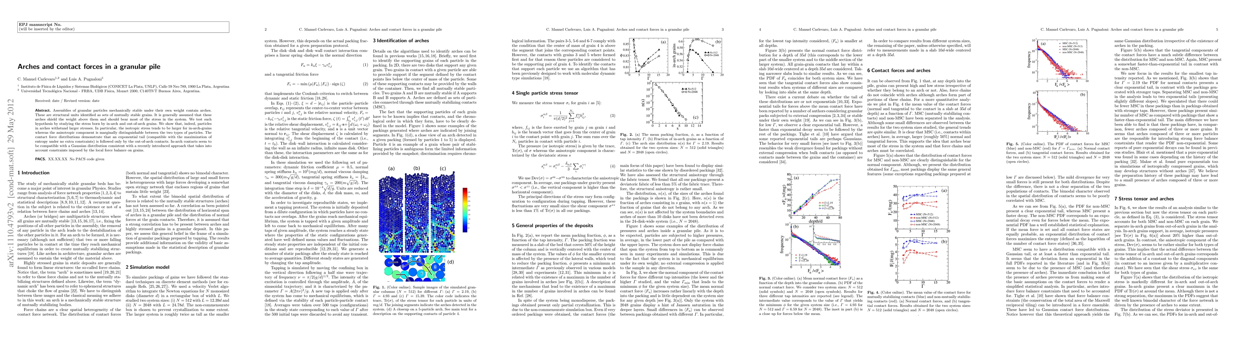 This paper investigates the stress distribution in granular piles, finding that particles forming arches bear significantly higher stress, particularly isotropic stress, compared to non-arch particles. The contact force distribution in out-of-arch contacts follows an exponential tail, while in-arch contacts follow a Gaussian distribution, suggesting different mechanical behaviors.