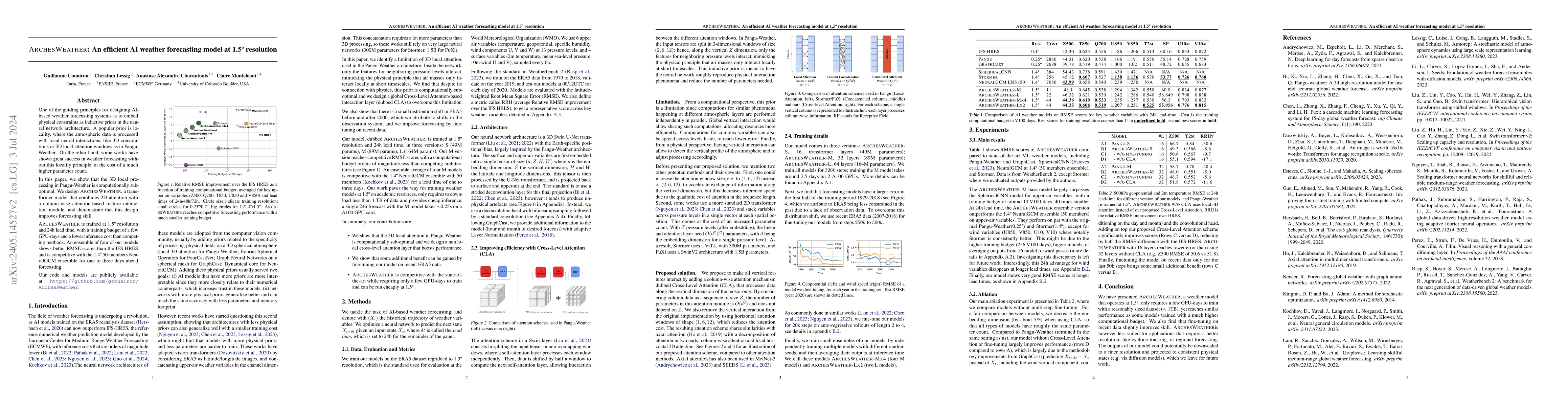 ArchesWeather presents a transformer-based model that integrates 2D attention with column-wise feature interaction to efficiently forecast weather at 1.5° resolution, demonstrating superior performance with lower computational costs compared to models relying on 3D locality. Ensemble forecasts outperform IFS HRES and are competitive with the NeuralGCM ensemble.