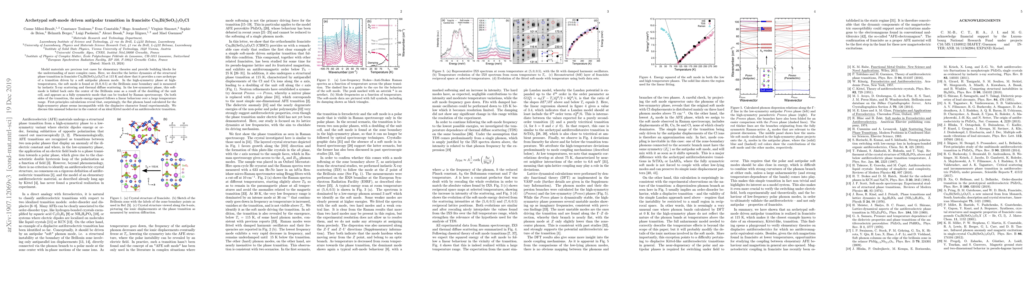 Model materials are precious test cases for elementary theories and provide building blocks for the understanding of more complex cases. Here, we describe the lattice dynamics of the structural phase transition in francisite Cu3Bi(SeO3)2O2Cl at 115 K and show that it provides a rare archetype of a transition driven by a soft antipolar phonon mode. In the high-symmetry phase at hightemperatures, the soft mode is found at (0,0,0.5) at the Brillouin zone boundary and is measured by inelastic X-ray scattering and thermal diffuse scattering. In the low-symmetry phase, this softmode is folded back onto the center of the Brillouin zone as a result of the doubling of the unit cell, and appears as a fully symmetric mode that can be tracked by Raman spectroscopy. On both sides of the transition, the mode energy squared follows a linear behaviour over a large temperature range. First-principles calculations reveal that, surprisingly, the flat phonon band calculated for the high-symmetry phase seems incompatible with the displacive character found experimentally. We discuss this unusual behavior in the context of an ideal Kittel model of an antiferroelectric transition.