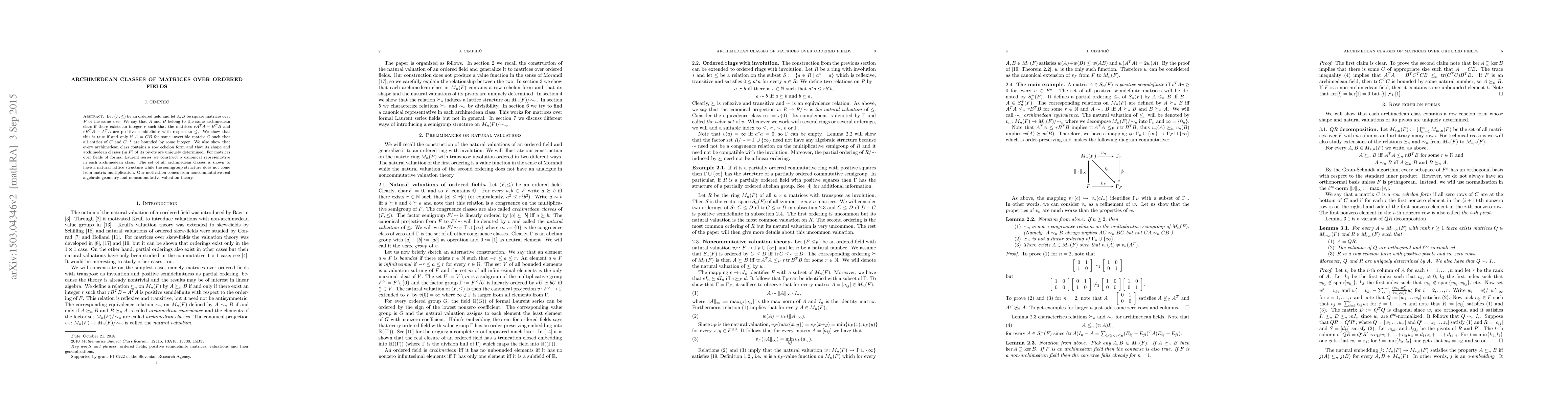 This paper explores the concept of archimedean classes of matrices over ordered fields, proving that matrices belong to the same class if and only if they can be related by an invertible matrix with bounded entries. It also establishes a lattice structure for these classes and constructs a canonical representative for matrices over fields of formal Laurent series.