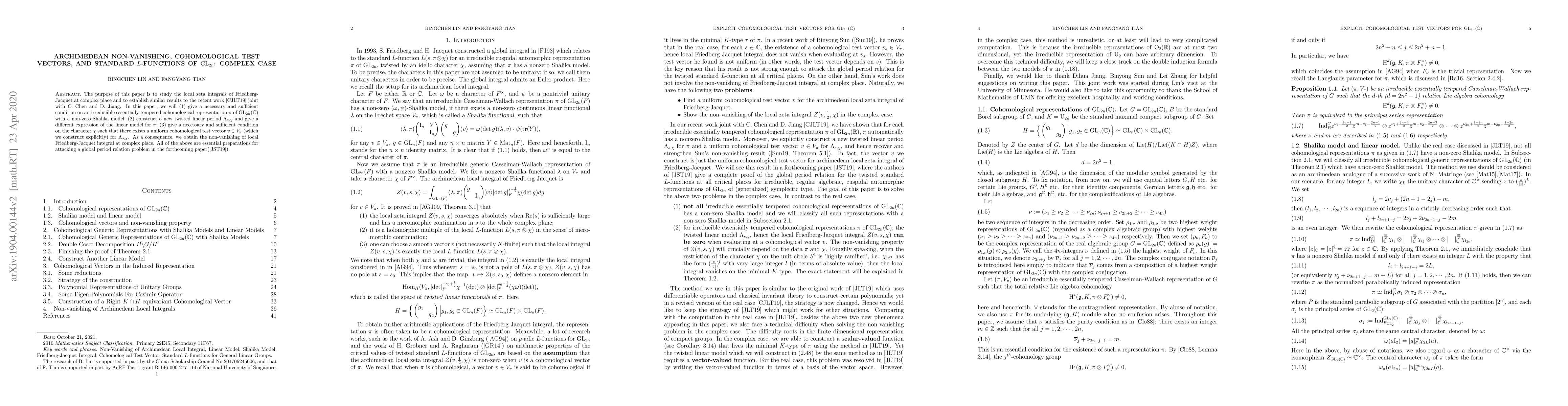 This paper investigates local zeta integrals at complex places, establishing conditions for non-vanishing and constructing new twisted linear periods. It provides necessary and sufficient conditions for irreducible cohomological representations and uniform cohomological test vectors, paving the way for global period relation problems.