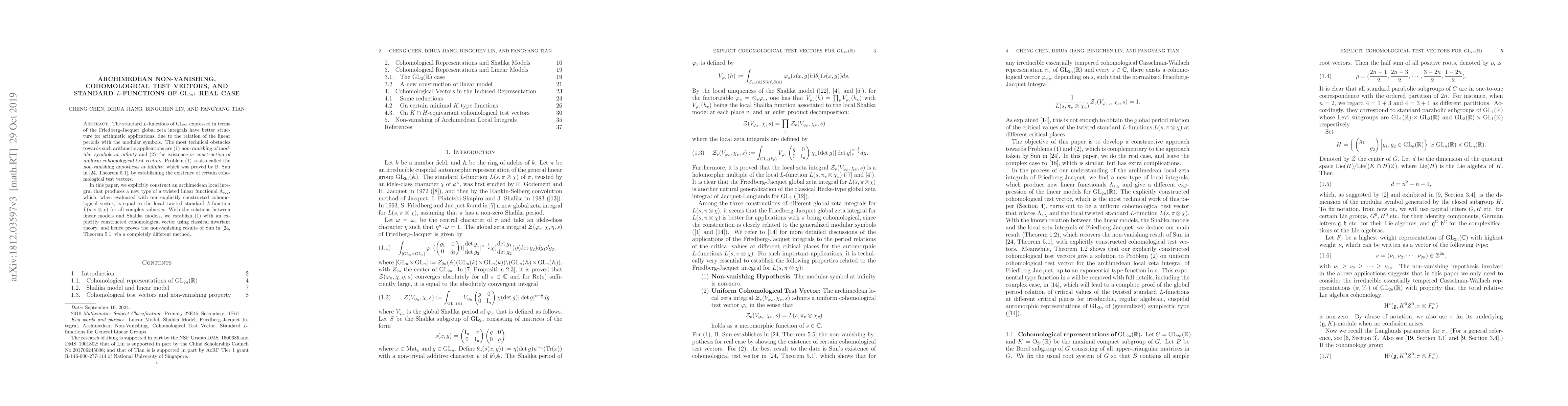 The standard $L$-functions of $\mathrm{GL}_{2n}$ expressed in terms of the Friedberg-Jacquet global zeta integrals have better structure for arithmetic applications, due to the relation of the linear periods with the modular symbols. The most technical obstacles towards such arithmetic applications are (1) non-vanishing of modular symbols at infinity and (2) the existance or construction of uniform cohomological test vectors. Problem (1) is also called the non-vanishing hypothesis at infinity, which was proved by Binyong Sun, by establishing the existence of certain cohomological test vectors. In this paper, we explicitly construct an archimedean local integral that produces a new type of a twisted linear functional $\Lambda_{s,\chi}$, which, when evaluated with our explicitly constructed cohomological vector, is equal to the local twisted standard $L$-function $L(s,\pi\otimes\chi)$ as a meromorphic function of $s\in \mathbb{C}$. With the relations between linear models and Shalika models, we establish (1) with an explicitly constructed cohomological vector, and hence recovers a non-vanishing result of Binyong Sun via a completely different method. Our main result indicates a complete solution to (2), which will be presented in a paper of Dihua Jiang, Binyong Sun and Fangyang Tian with full details and with applications to the global period relations for the twisted standard $L$-functions at critical places.