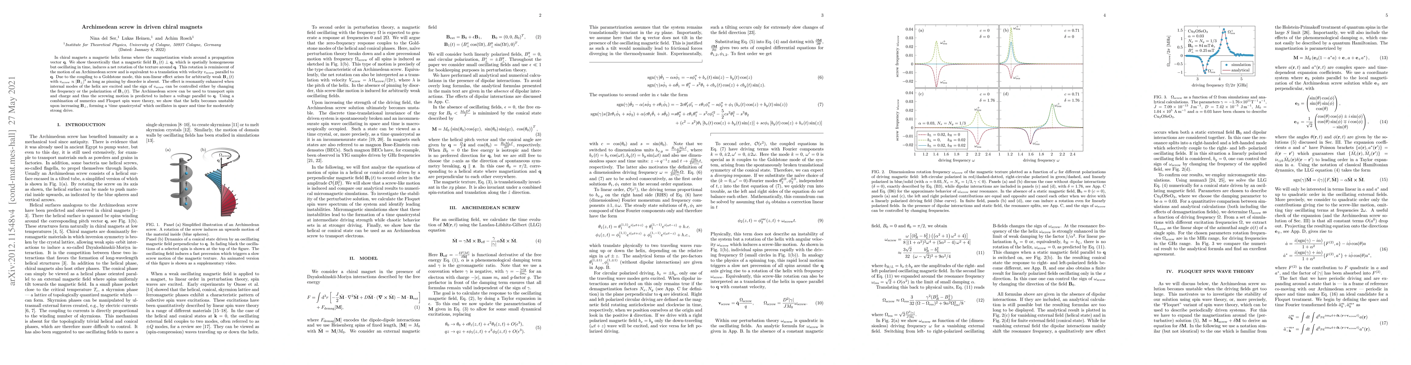 This paper theoretically demonstrates that an oscillating magnetic field perpendicular to the propagation vector in chiral magnets induces a net rotation akin to an Archimedean screw, enabling spin and charge transport. The rotation velocity is proportional to the square of the field strength and can be controlled by its frequency or polarization.