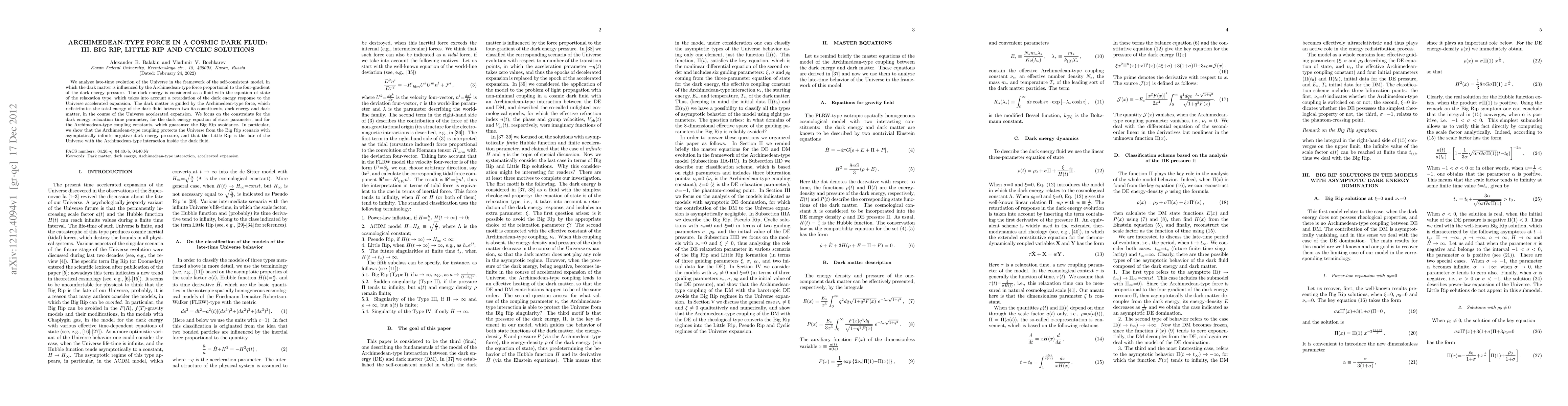This paper investigates the late-time evolution of the Universe using a model that incorporates an Archimedean-type force guiding dark matter, which redistributes energy between dark energy and dark matter, avoiding Big Rip scenarios while allowing for Little Rip solutions.