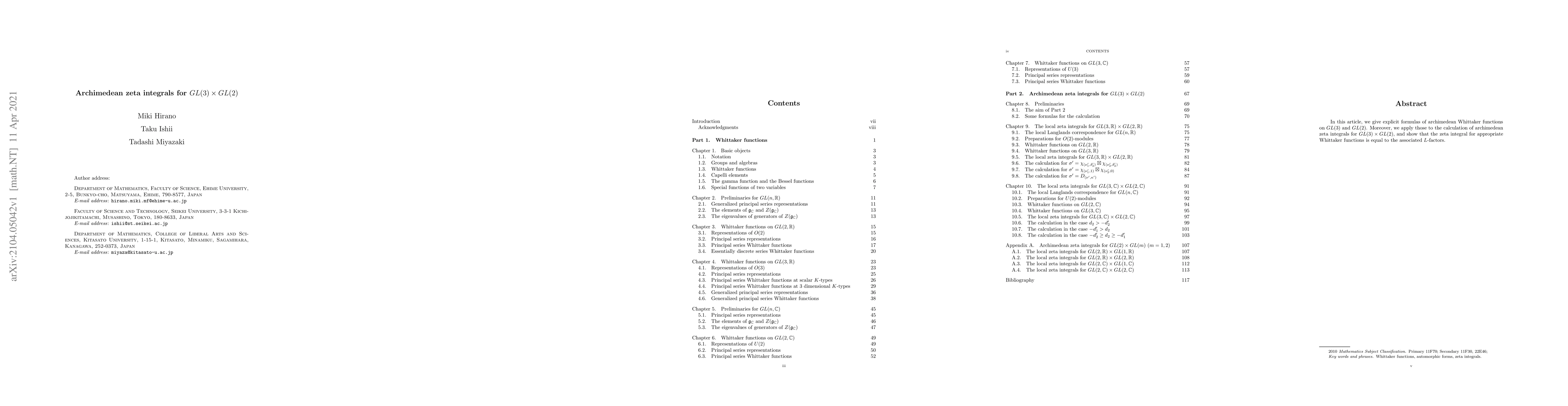 This paper provides explicit formulas for archimedean Whittaker functions on $GL(3)$ and $GL(2)$, and uses these to calculate archimedean zeta integrals for $GL(3) \times GL(2)$, demonstrating equivalence to associated $L$-factors.