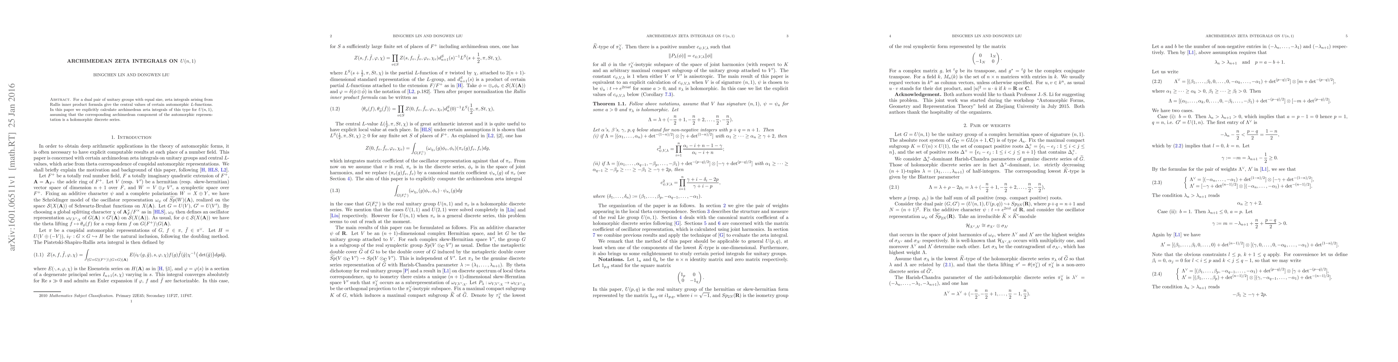 For a dual pair of unitary groups with equal size, zeta integrals arising from Rallis inner product formula give the central values of certain automorphic L-functions. In this paper we explicitly calculate archimedean zeta integrals of this type for U(n,1), assuming that the corresponding archimedean component of the automorphic representation is a holomorphic discrete series.