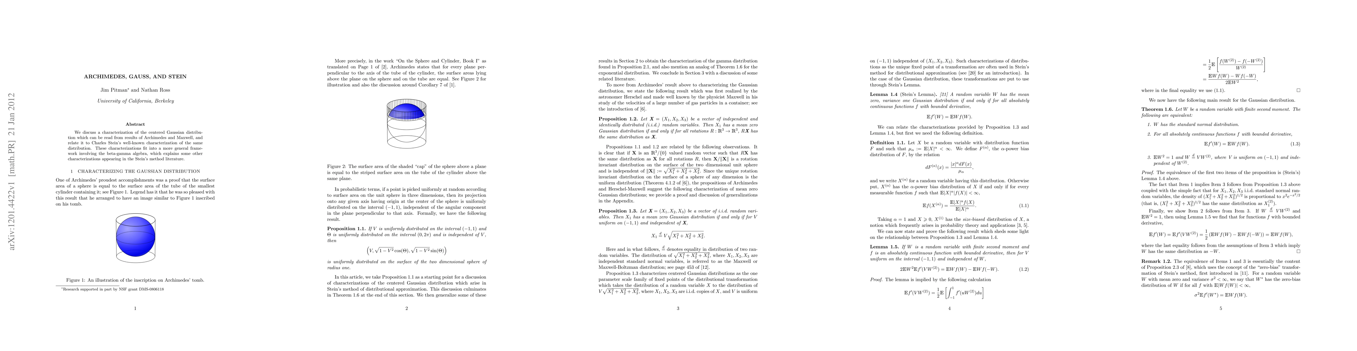 We discuss a characterization of the centered Gaussian distribution which can be read from results of Archimedes and Maxwell, and relate it to Charles Stein's well-known characterization of the same distribution. These characterizations fit into a more general framework involving the beta-gamma algebra, which explains some other characterizations appearing in the Stein's method literature.