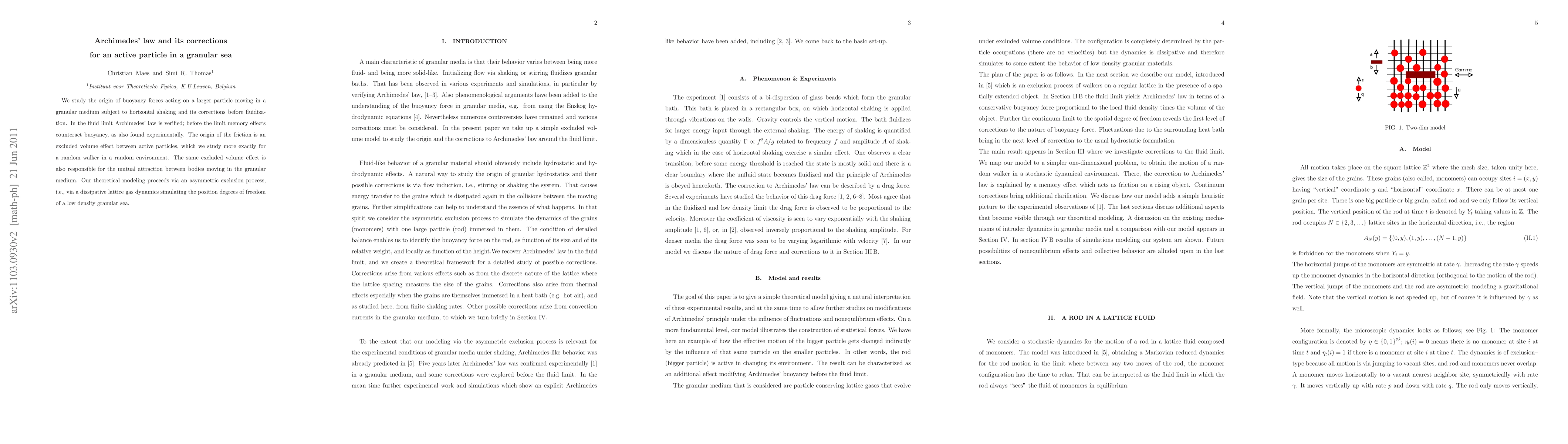 We study the origin of buoyancy forces acting on a larger particle moving in a granular medium subject to horizontal shaking and its corrections before fluidization. In the fluid limit Archimedes' law is verified; before the limit memory effects counteract buoyancy, as also found experimentally. The origin of the friction is an excluded volume effect between active particles, which we study more exactly for a random walker in a random environment. The same excluded volume effect is also responsible for the mutual attraction between bodies moving in the granular medium. Our theoretical modeling proceeds via an asymmetric exclusion process, i.e., via a dissipative lattice gas dynamics simulating the position degrees of freedom of a low density granular sea.