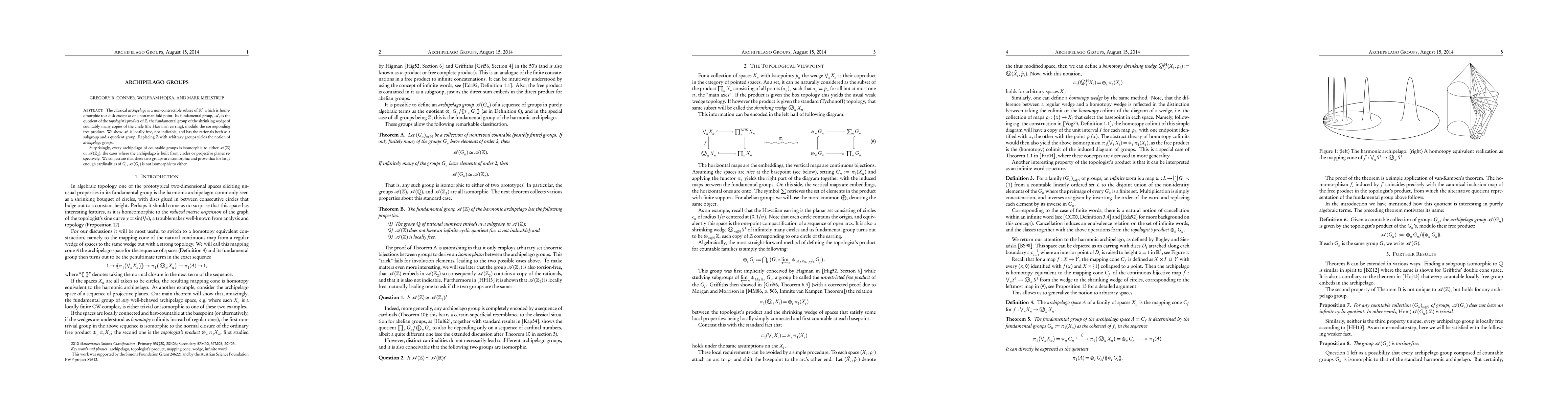 The classical archipelago is a non-contractible subset of $\mathbb{R}^3$ which is homeomorphic to a disk except at one non-manifold point. Its fundamental group, $\mathcal{A}$, is the quotient of the topologist's product of $\mathbb Z$, the fundamental group of the shrinking wedge of countably many copies of the circle (the Hawaiian earring), modulo the corresponding free product. We show $\mathcal{A}$ is locally free, not indicable, and has the rationals both as a subgroup and a quotient group. Replacing $\mathbb Z$ with arbitrary groups yields the notion of archipelago groups. Surprisingly, every archipelago of countable groups is isomorphic to either $\mathcal{A}(\mathbb Z)$ or $\mathcal{A}(\mathbb Z_2)$, the cases where the archipelago is built from circles or projective planes respectively. We conjecture that these two groups are isomorphic and prove that for large enough cardinalities of $G_i$, $\mathcal{A}(G_i)$ is not isomorphic to either.