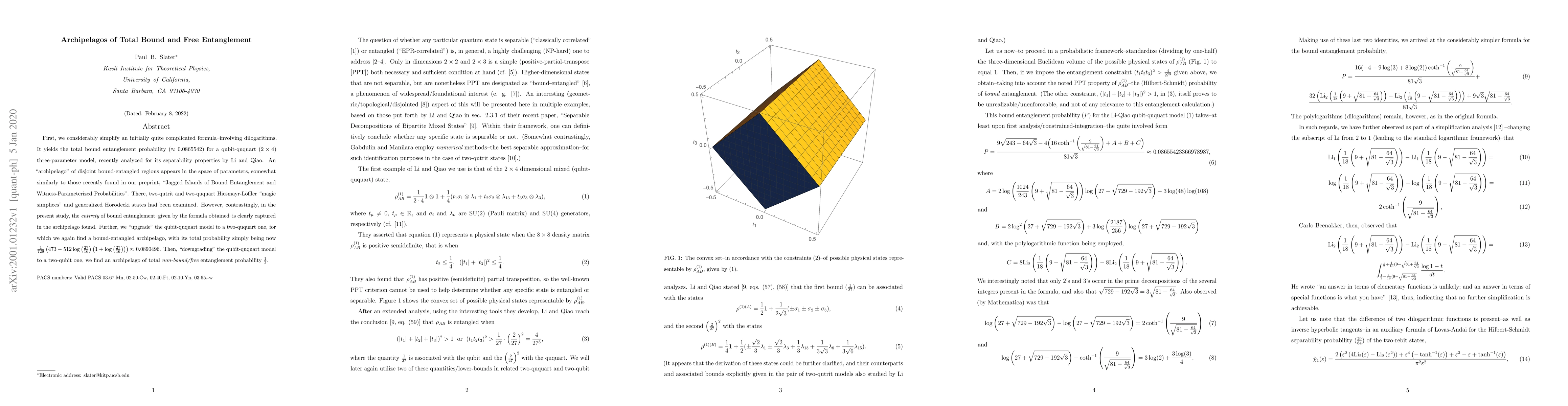 First, we considerably simplify an initially quite complicated formula -- involving dilogarithms. It yields the total bound entanglement probability ($\approx 0.0865542$) for a qubit-ququart ($2 \times 4$) three-parameter model, recently analyzed for its separability properties by Li and Qiao. An "archipelago" of disjoint bound-entangled regions appears in the space of parameters, somewhat similarly to those recently found in our preprint, "Jagged Islands of Bound Entanglement and Witness-Parameterized Probabilities". There, two-qutrit and two-ququart Hiesmayr-L{\"o}ffler "magic simplices" and generalized Horodecki states had been examined. However, contrastingly, in the present study, the entirety of bound entanglement--given by the formula obtained--is clearly captured in the archipelago found. Further, we "upgrade" the qubit-ququart model to a two-ququart one, for which we again find a bound-entangled archipelago, with its total probability simply being now $\frac{1}{729} \left(473-512 \log \left(\frac{27}{16}\right) \left(1+\log \left(\frac{27}{16}\right)\right)\right) \approx 0.0890496$. Then, "downgrading" the qubit-ququart model to a two-qubit one, we find an archipelago of total non-bound/free entanglement probability $\frac{1}{2}$.