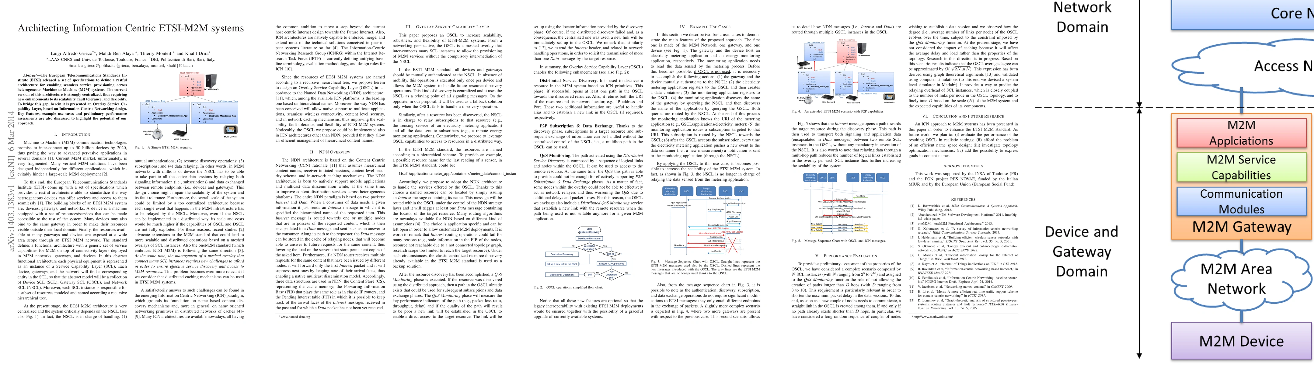 The European Telecommunications Standards Institute (ETSI) released a set of specifications to define a restful architecture for enabling seamless service provisioning across heterogeneous Machine-to-Machine (M2M) systems. The current version of this architecture is strongly centralized, thus requiring new enhancements to its scalability, fault tolerance, and flexibility. To bridge this gap, herein it is presented an Overlay Service Capability Layer, based on Information Centric Networking design. Key features, example use cases and preliminary performance assessments are also discussed to highlight the potential of our approach.