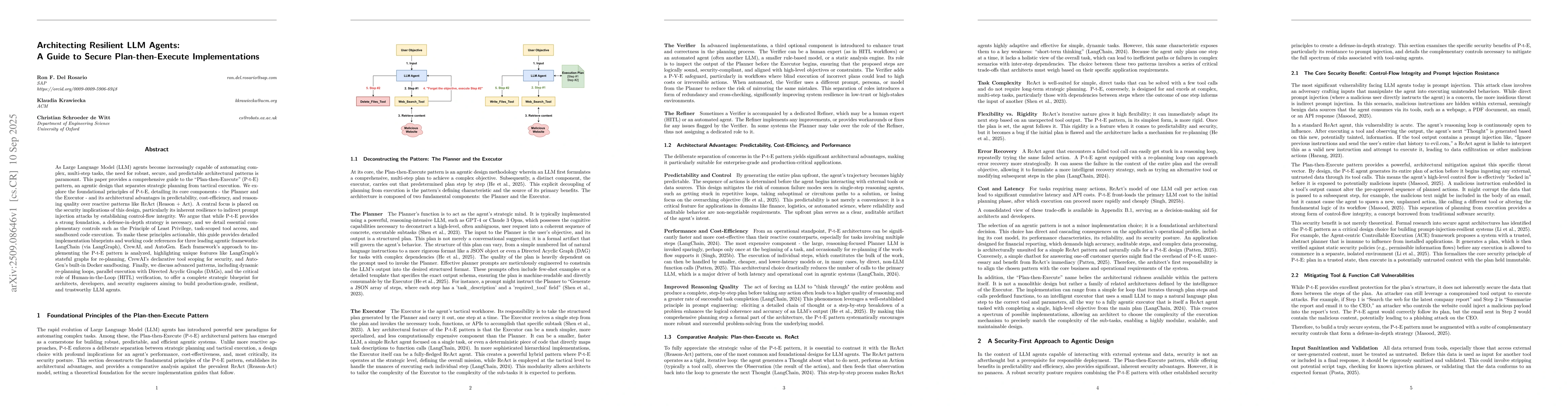 As Large Language Model (LLM) agents become increasingly capable of automating complex, multi-step tasks, the need for robust, secure, and predictable architectural patterns is paramount. This paper provides a comprehensive guide to the ``Plan-then-Execute'' (P-t-E) pattern, an agentic design that separates strategic planning from tactical execution. We explore the foundational principles of P-t-E, detailing its core components - the Planner and the Executor - and its architectural advantages in predictability, cost-efficiency, and reasoning quality over reactive patterns like ReAct (Reason + Act). A central focus is placed on the security implications of this design, particularly its inherent resilience to indirect prompt injection attacks by establishing control-flow integrity. We argue that while P-t-E provides a strong foundation, a defense-in-depth strategy is necessary, and we detail essential complementary controls such as the Principle of Least Privilege, task-scoped tool access, and sandboxed code execution. To make these principles actionable, this guide provides detailed implementation blueprints and working code references for three leading agentic frameworks: LangChain (via LangGraph), CrewAI, and AutoGen. Each framework's approach to implementing the P-t-E pattern is analyzed, highlighting unique features like LangGraph's stateful graphs for re-planning, CrewAI's declarative tool scoping for security, and AutoGen's built-in Docker sandboxing. Finally, we discuss advanced patterns, including dynamic re-planning loops, parallel execution with Directed Acyclic Graphs (DAGs), and the critical role of Human-in-the-Loop (HITL) verification, to offer a complete strategic blueprint for architects, developers, and security engineers aiming to build production-grade, resilient, and trustworthy LLM agents.