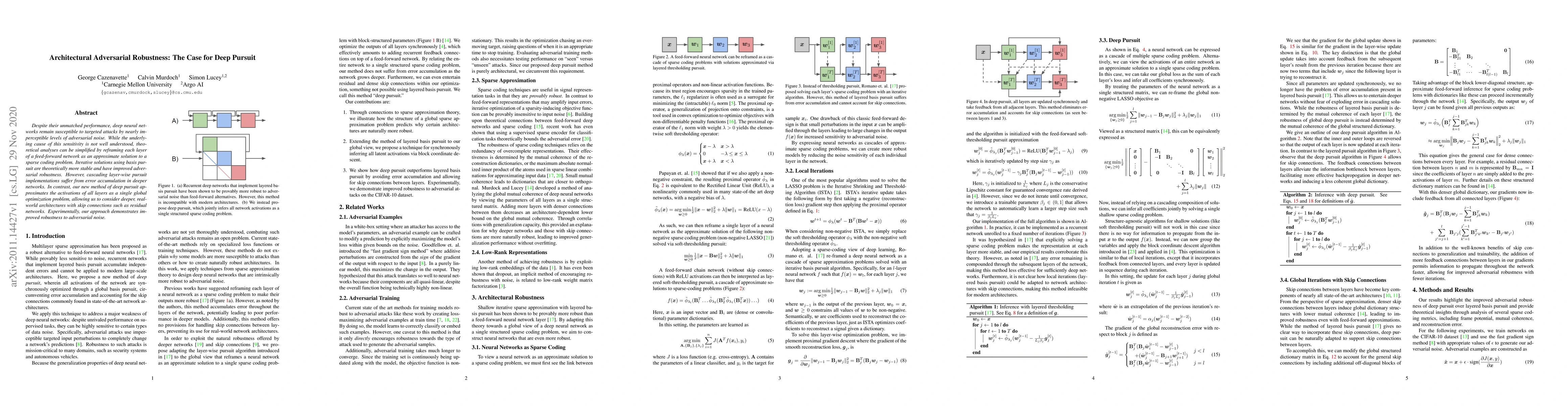 Despite their unmatched performance, deep neural networks remain susceptible to targeted attacks by nearly imperceptible levels of adversarial noise. While the underlying cause of this sensitivity is not well understood, theoretical analyses can be simplified by reframing each layer of a feed-forward network as an approximate solution to a sparse coding problem. Iterative solutions using basis pursuit are theoretically more stable and have improved adversarial robustness. However, cascading layer-wise pursuit implementations suffer from error accumulation in deeper networks. In contrast, our new method of deep pursuit approximates the activations of all layers as a single global optimization problem, allowing us to consider deeper, real-world architectures with skip connections such as residual networks. Experimentally, our approach demonstrates improved robustness to adversarial noise.