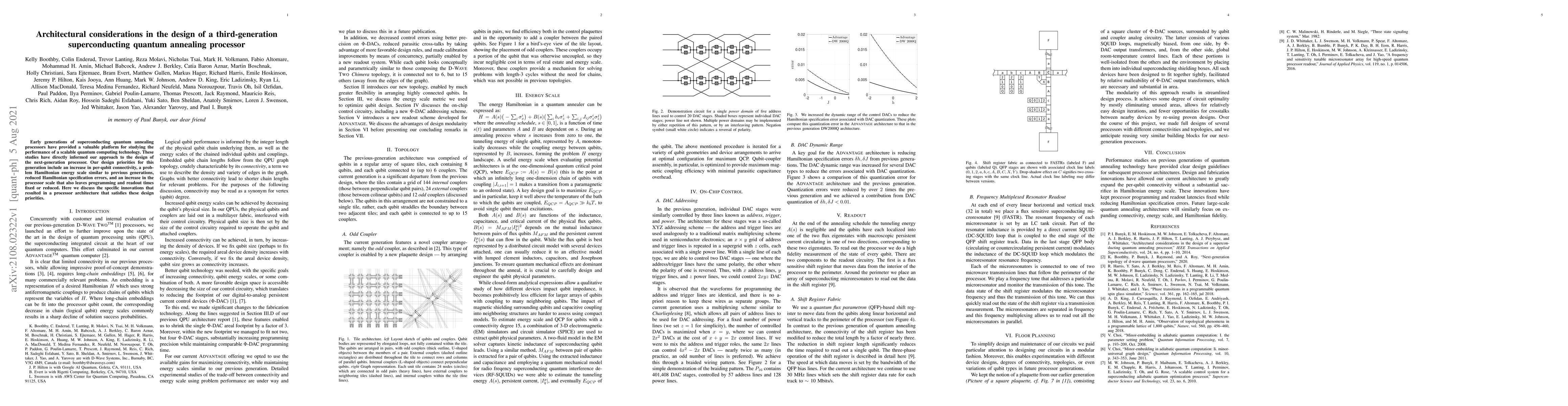 This paper outlines the architectural innovations in the third-generation superconducting quantum annealing processor, focusing on enhanced per-qubit connectivity, consistent problem Hamiltonian energy scale, minimized Hamiltonian errors, and increased processor scale while maintaining or reducing programming and readout times. The design prioritizes scalability and performance improvements for quantum computing technology.