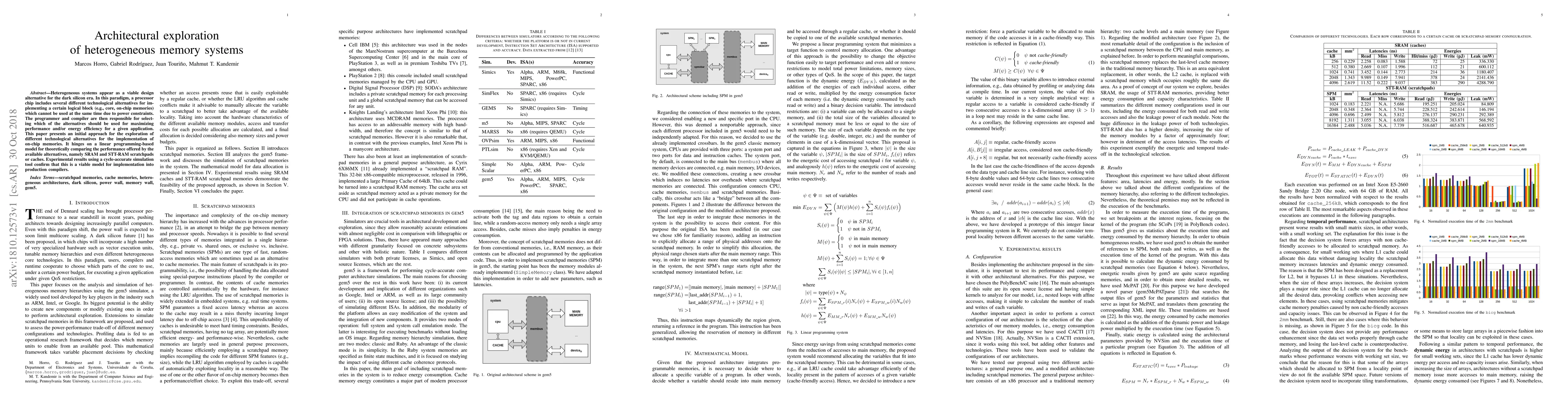 Heterogeneous systems appear as a viable design alternative for the dark silicon era. In this paradigm, a processor chip includes several different technological alternatives for implementing a certain logical block (e.g., core, on-chip memories) which cannot be used at the same time due to power constraints. The programmer and compiler are then responsible for selecting which of the alternatives should be used for maximizing performance and/or energy efficiency for a given application. This paper presents an initial approach for the exploration of different technological alternatives for the implementation of on-chip memories. It hinges on a linear programming-based model for theoretically comparing the performance offered by the available alternatives, namely SRAM and STT-RAM scratchpads or caches. Experimental results using a cycle-accurate simulation tool confirm that this is a viable model for implementation into production compilers.
